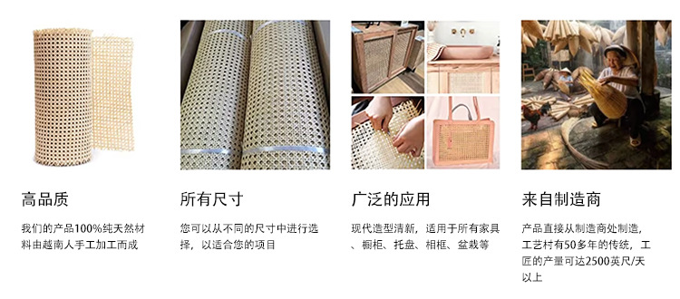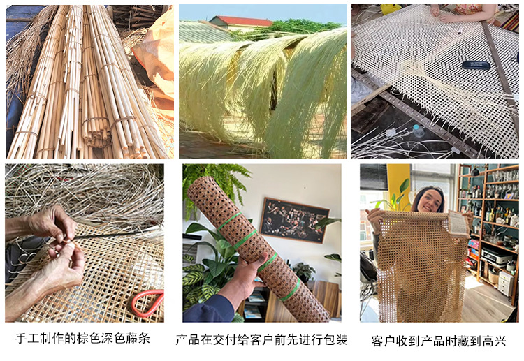 首先,从我们农场采集生藤材料(藤条),只有质量好的材料制作藤条网。然后,我们必须清洗藤条材料,让它们在阳光下晒干。藤条编织由经验丰富的工匠手工编织而成。我们制造的类型有六角形、方形、封闭型,还有许多漂亮的类型。