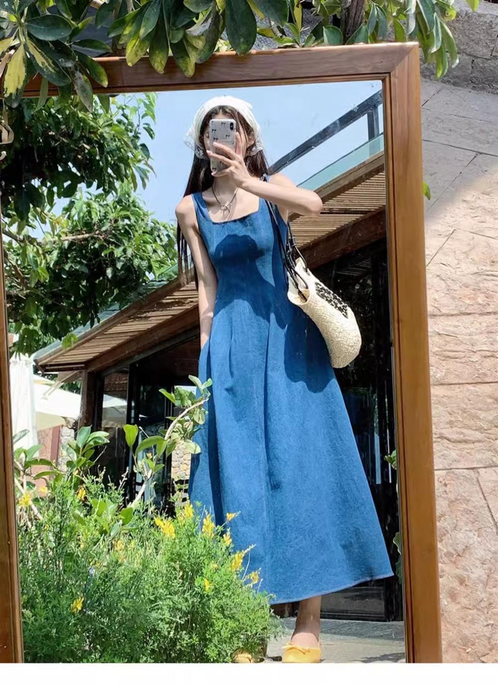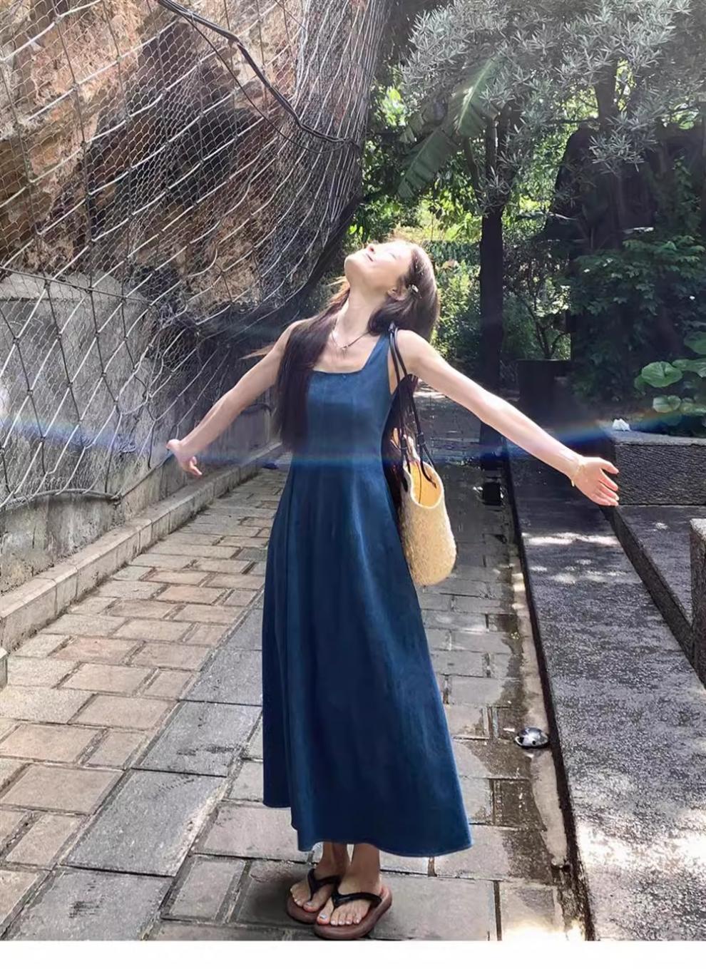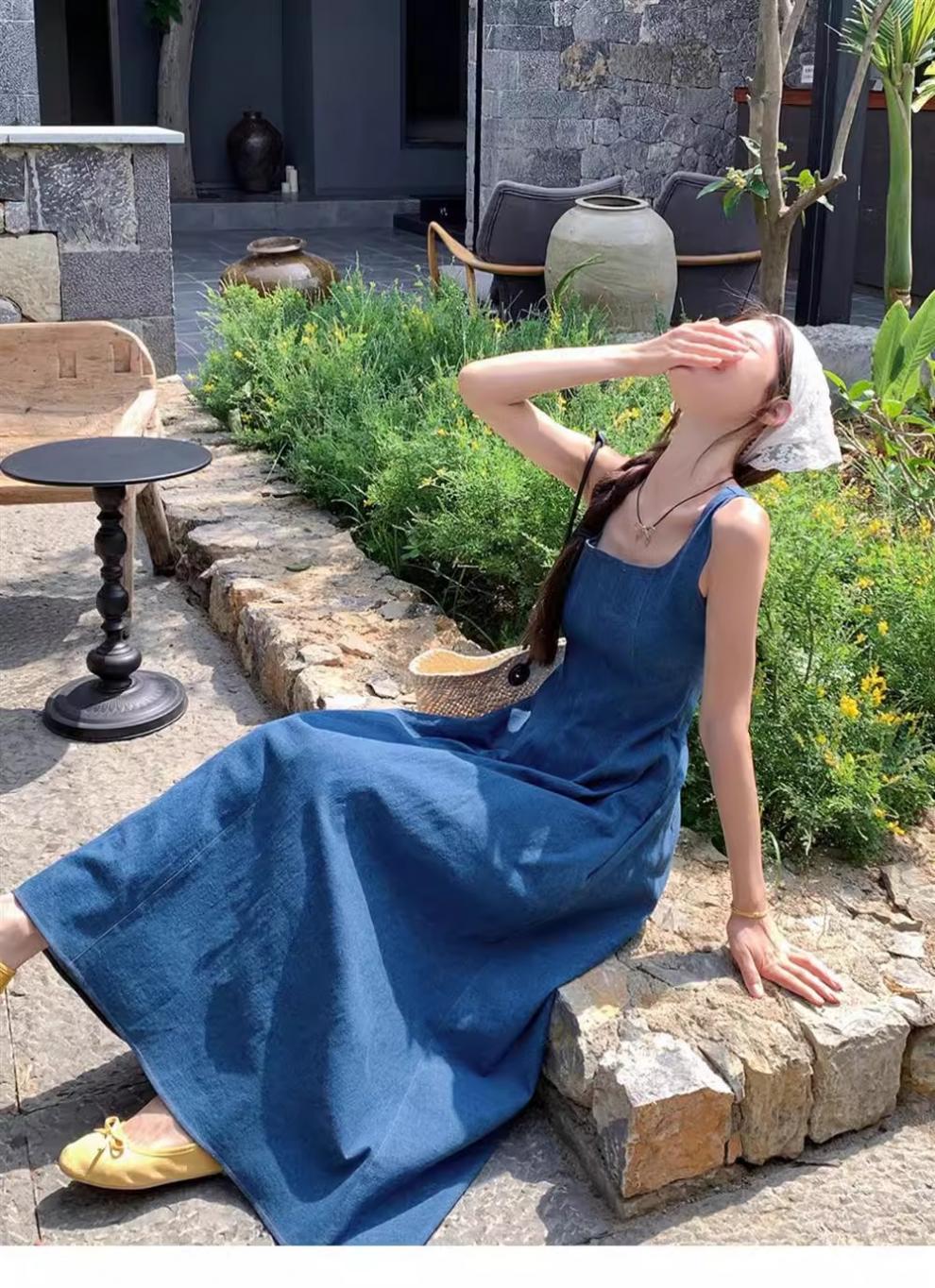 ブルーミストラブフレンチデニムドレスレディースサマーニッチデザインウエスト気質サスペンダーロングスカート