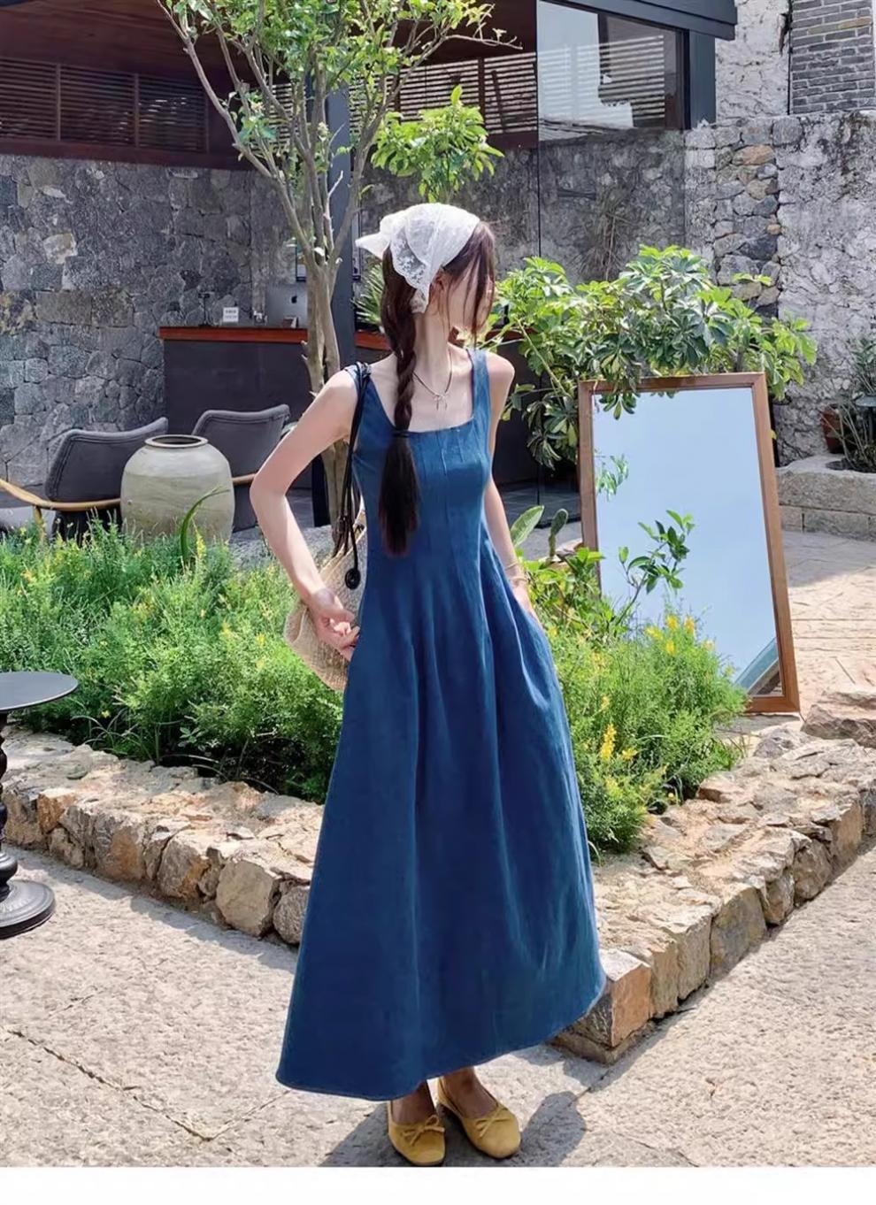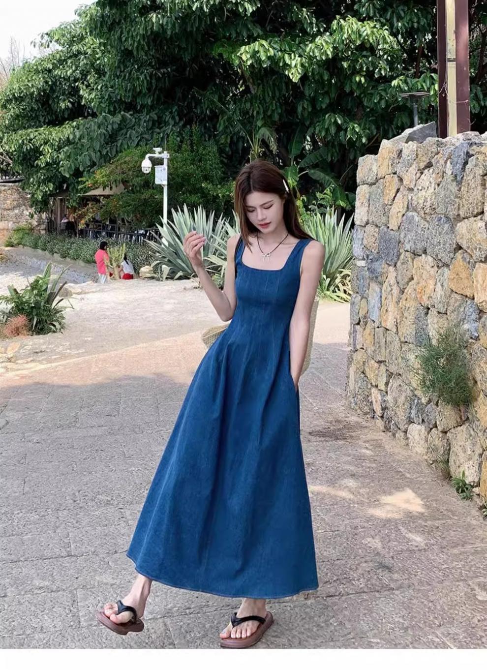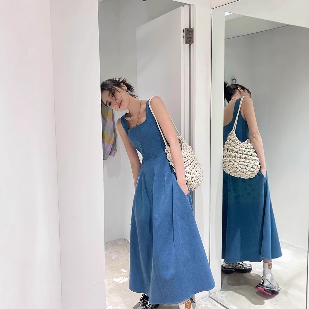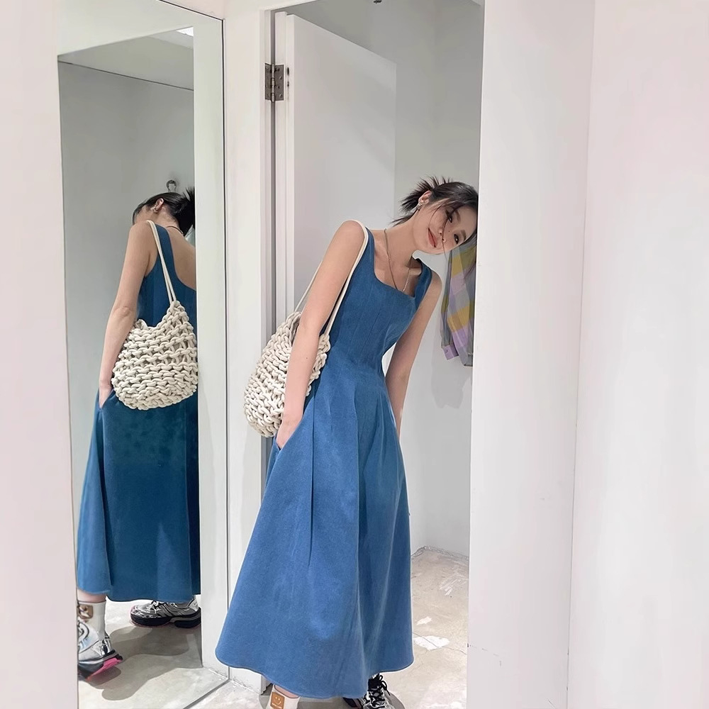 2025年新作 ダブルポケット フレンチスタイルワンピース レディース 夏 ニッチデザイン ウエストシェイプ イミテーションデニム サスペンダーロングワンピース