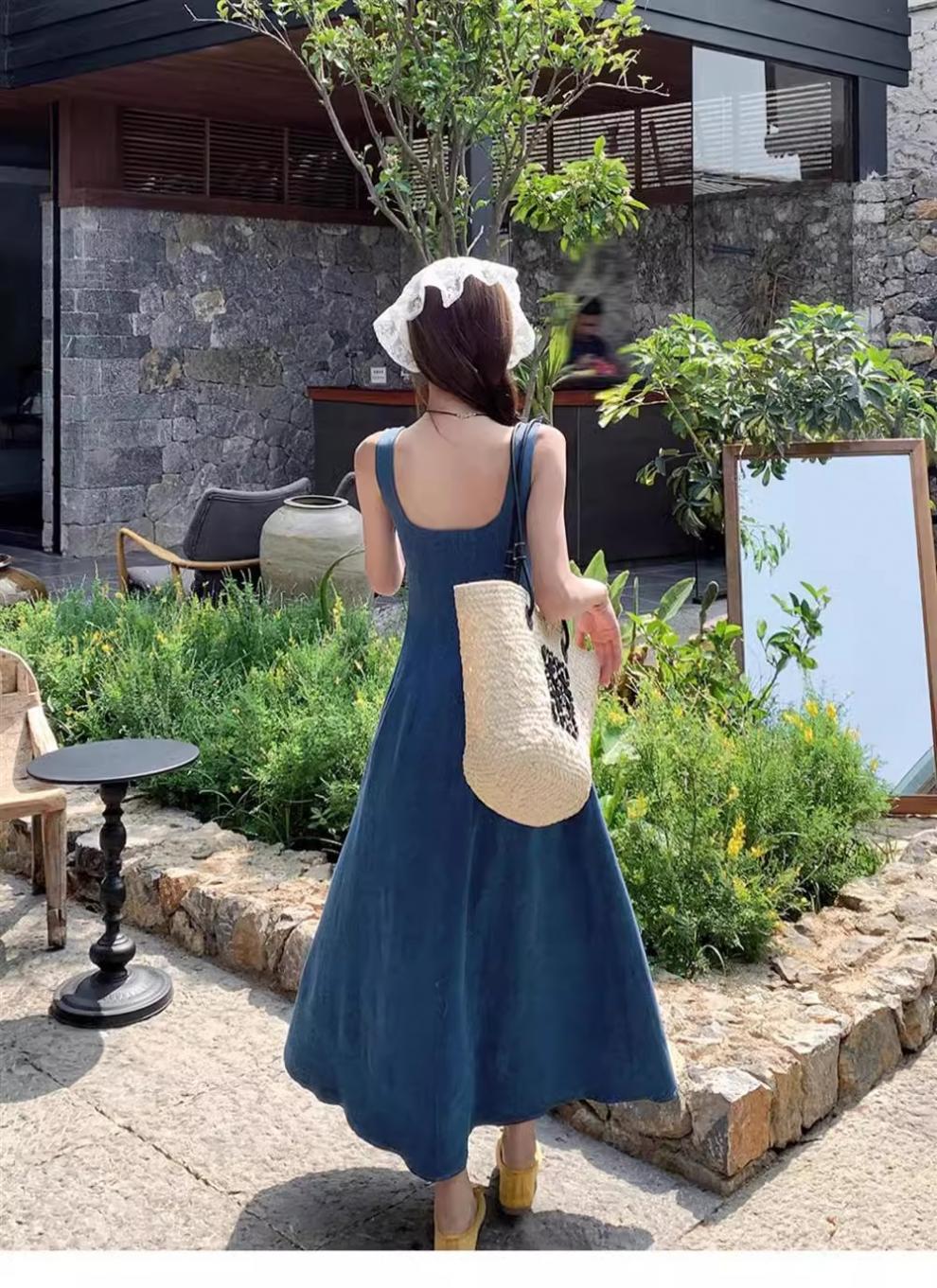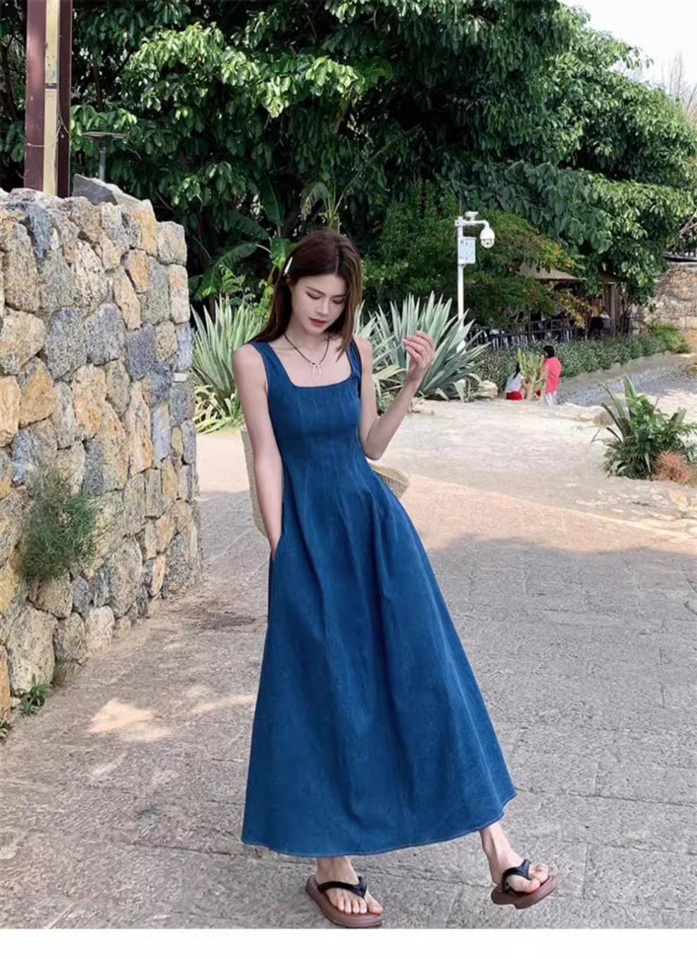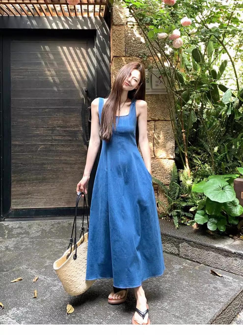 2025年新作 ダブルポケット フレンチスタイルワンピース レディース 夏 ニッチデザイン ウエストシェイプ イミテーションデニム サスペンダーロングワンピース