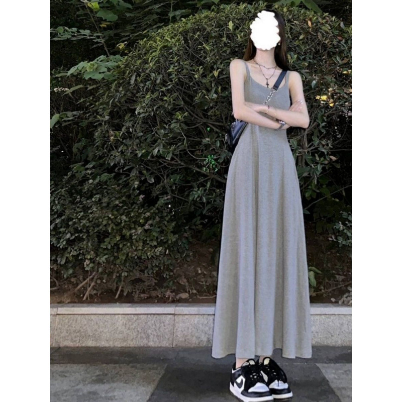 法式复古灰色带胸垫吊带连衣裙女夏季收腰气质设计感内搭包臀长裙