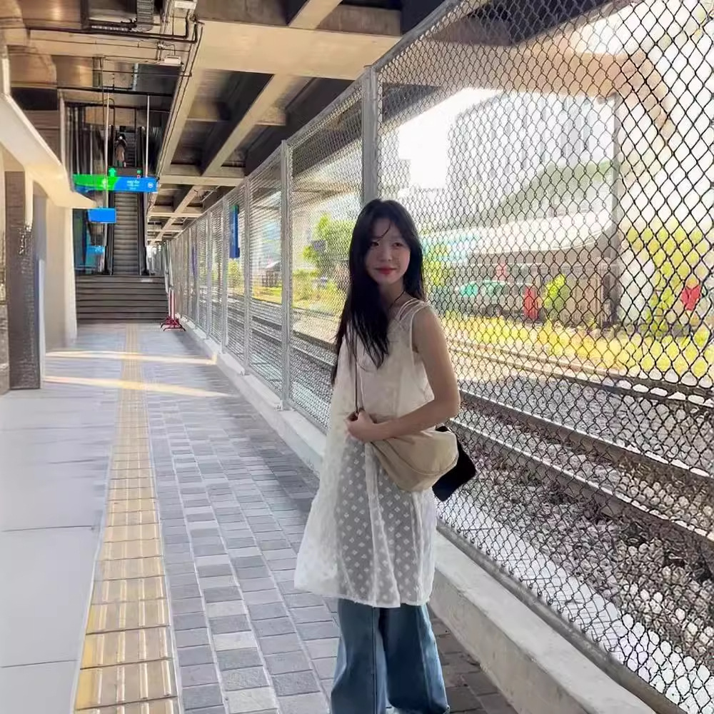デザイン感のある大衆は、中長のブラウスを重ねてレースのネット糸を着て、袖のない中にストラップをつけてベストのワンピースを着ている女性