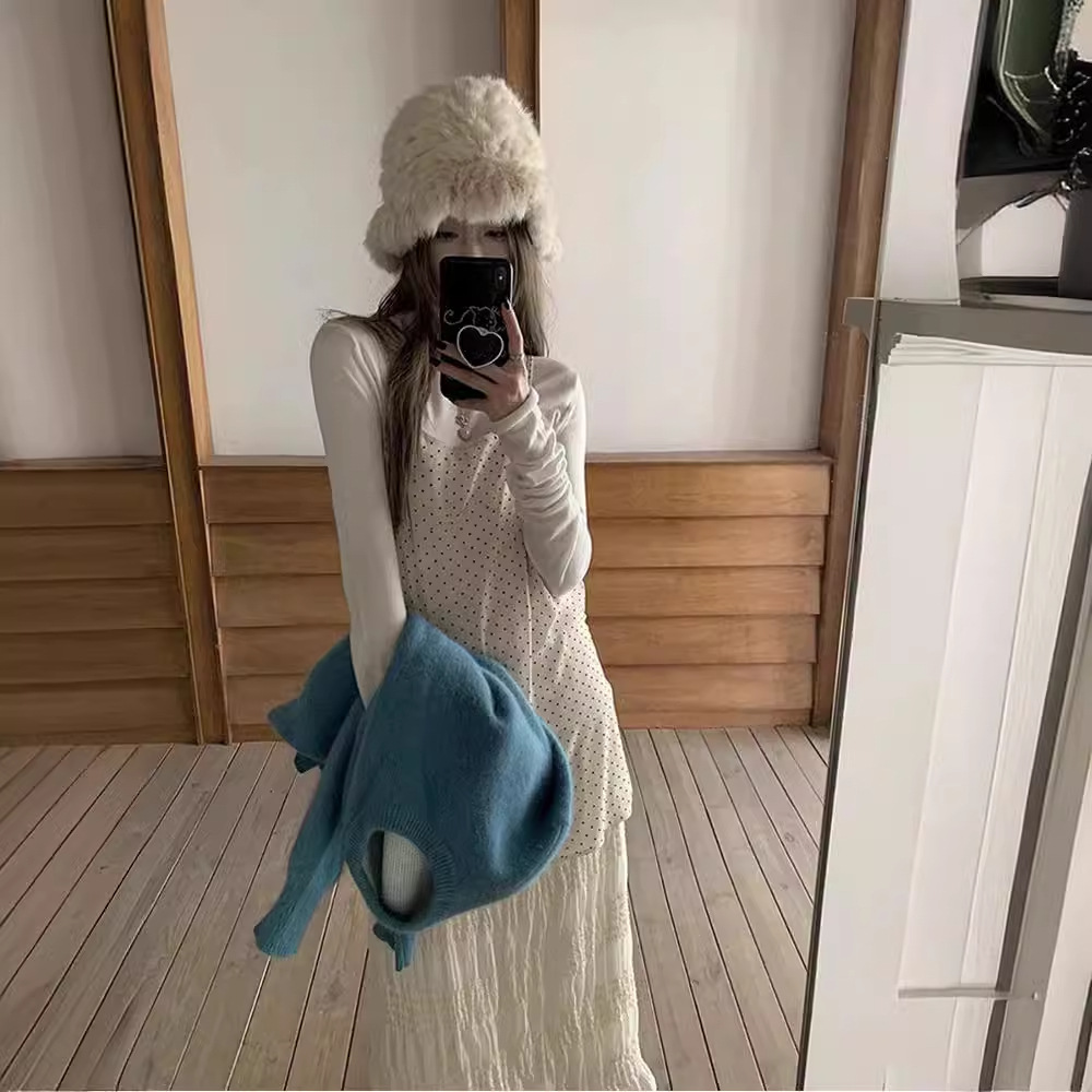 韓系甜妹は年齢を減らして重ねて波点のガーターのワンピースを着ます。