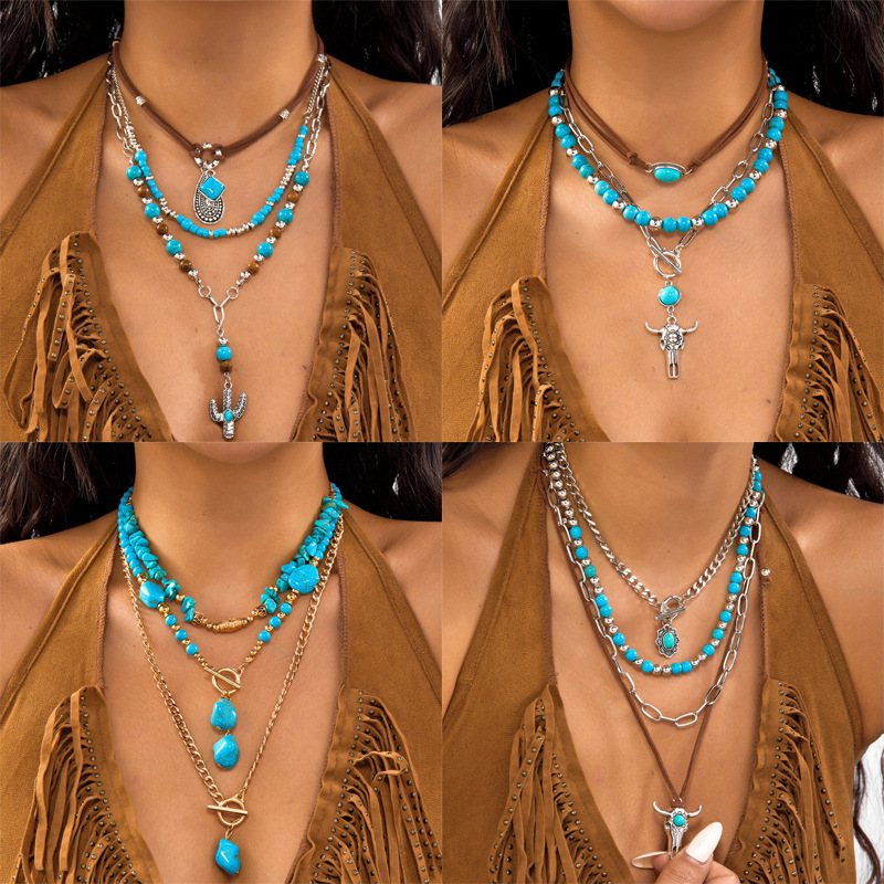 欧美波西米亚度假风串珠几何松石项链 复古西部牛仔多层项链套装
