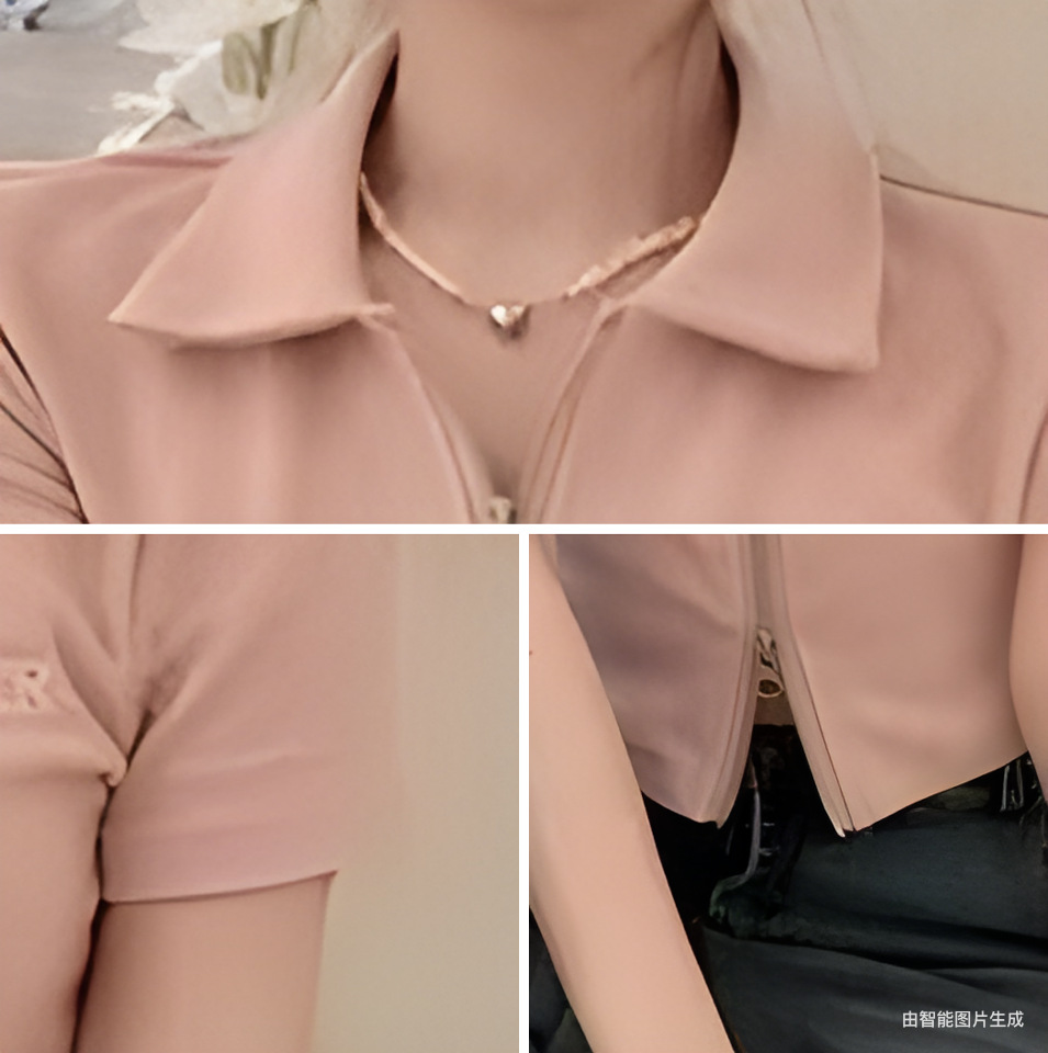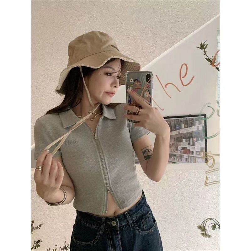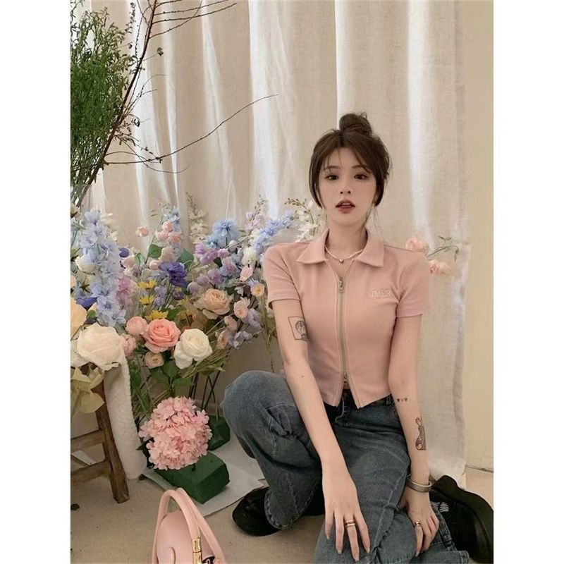 ファッション双ファスナーデザインpolo襟半袖tシャツ女性夏の甘いギャル