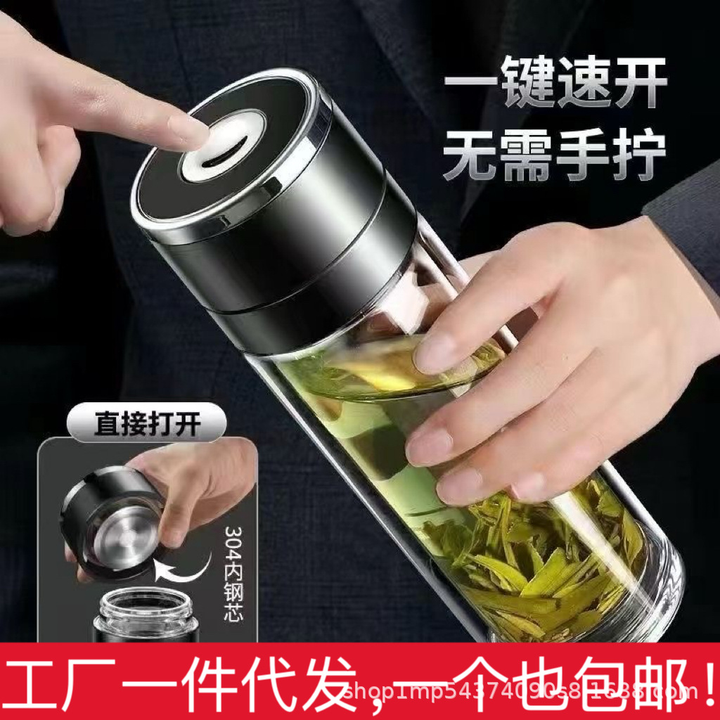 ワンクリックで蓋を開ける車用二重層ガラス男性用オフィス断熱ウォーターカップティーカップクイックオープン茶水分離カップ