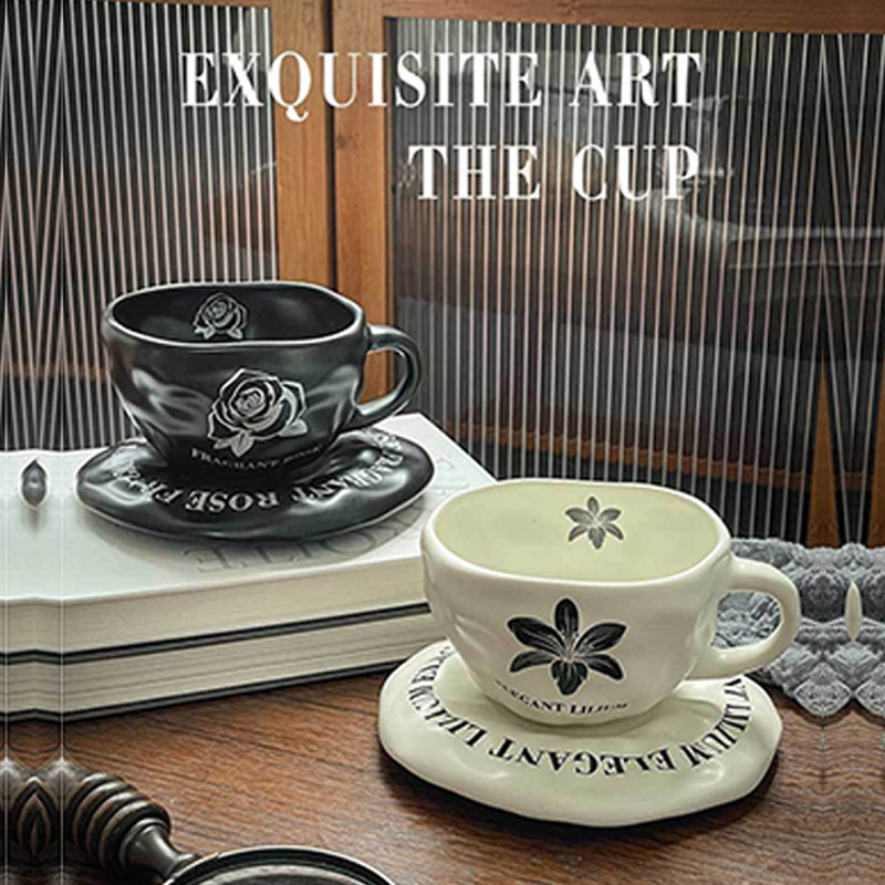 复古花朵手捏陶瓷杯碟套装黑白创意伴手礼咖啡杯高颜值下午茶盘子