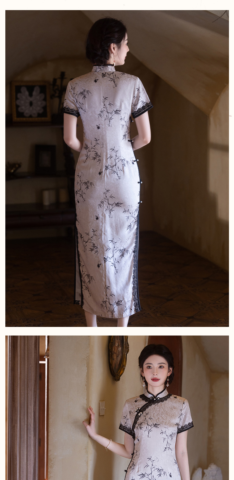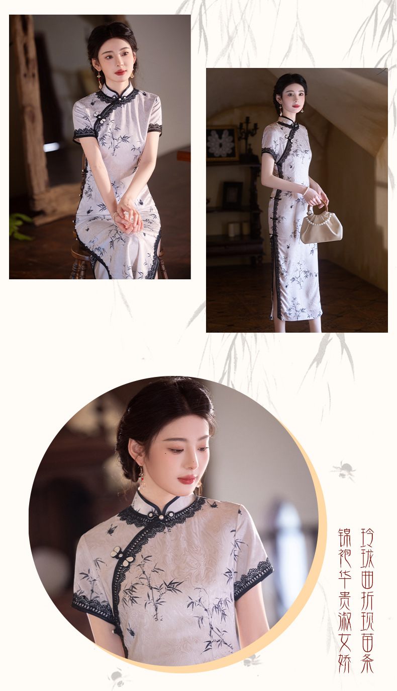 2025春夏の新型チャイナドレスの高品質は腰を収めて肉を遮ってやせているチャイナドレスの復古的な軽豪華な七分袖チャイナドレスの現物を表します。