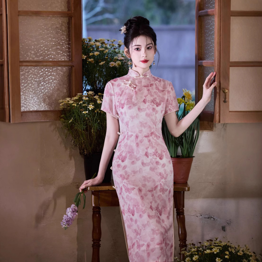 2025夏の新型チャイナドレスの若いタイプのピンクの半袖の修身の中の長いタイプのチャイナドレスの立襟の側の8ボタンの女性のチャイナドレス
