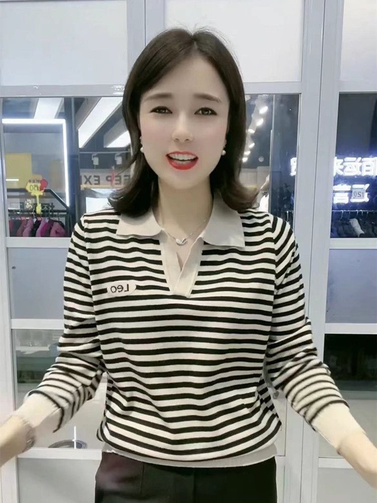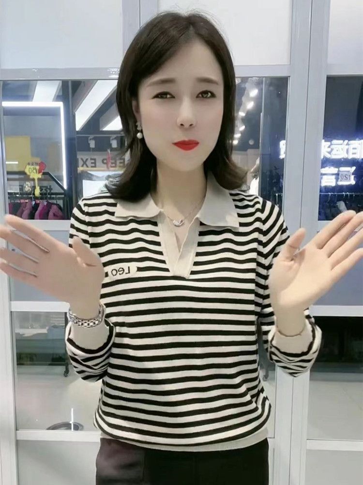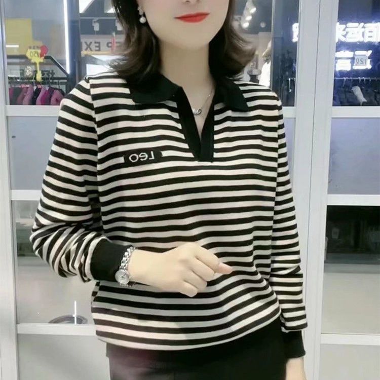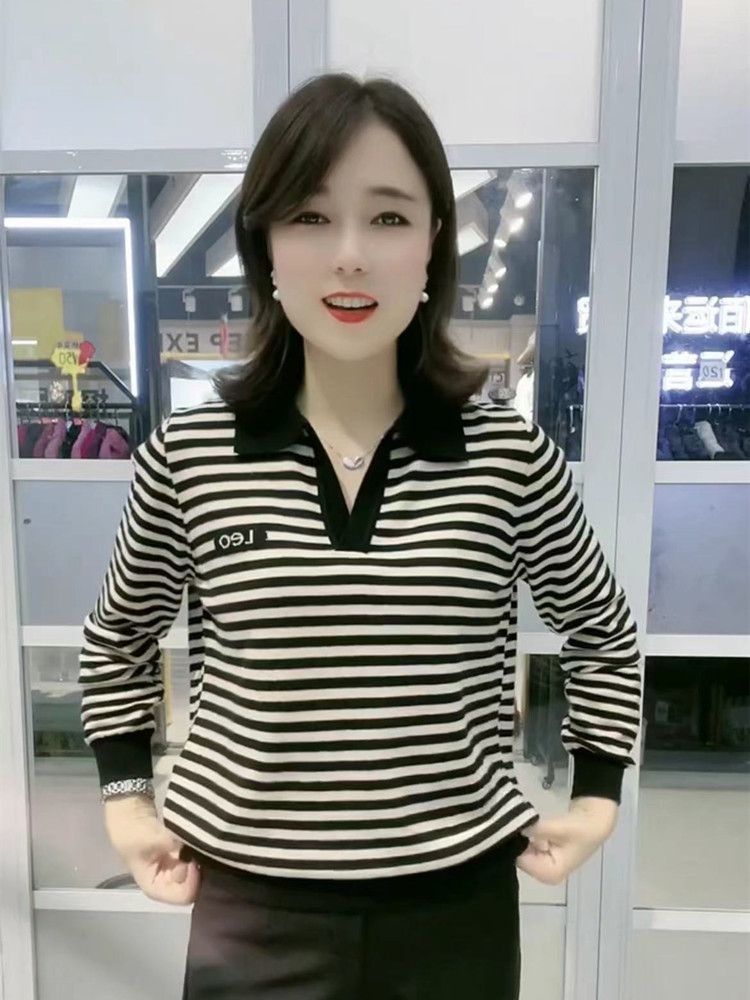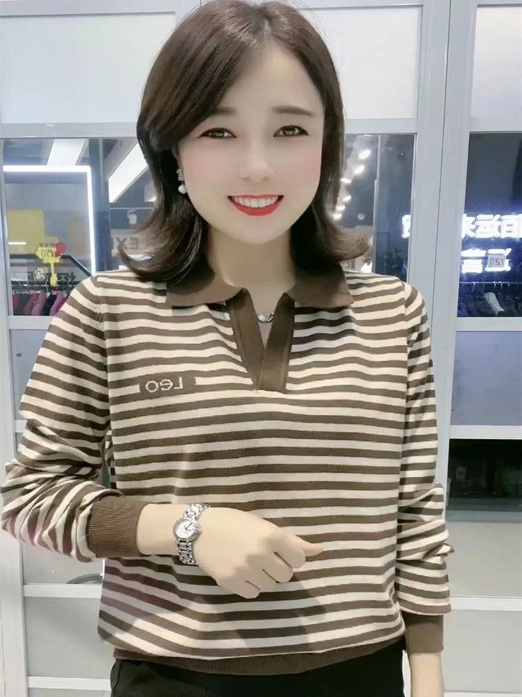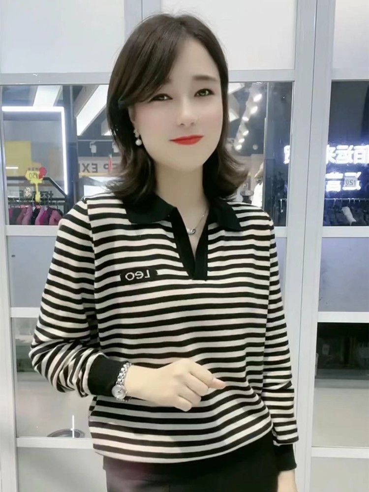 韓国の長袖のtシャツの女性の中年のお母さんの洋気の秋の服装のゆったりしている底のシャツの2024の新型のストライプの秋の服の上着