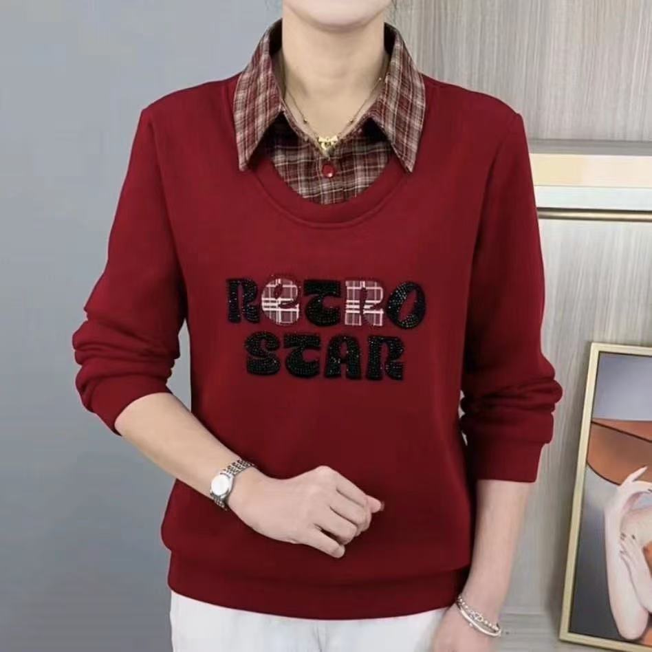 2025秋季爆款假两件上衣宽松显瘦妈妈装时尚百搭长袖T恤
