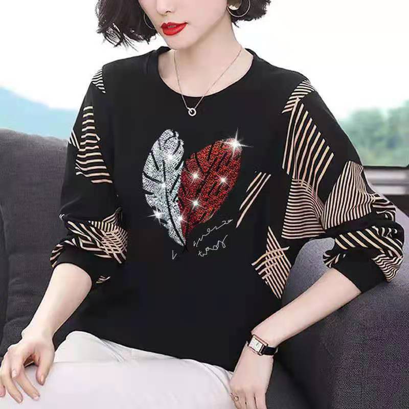 韓国の長袖tシャツの女性vネックのホットドリルの秋の新型のお母さんの服はゆったりとお腹を隠して痩せています。