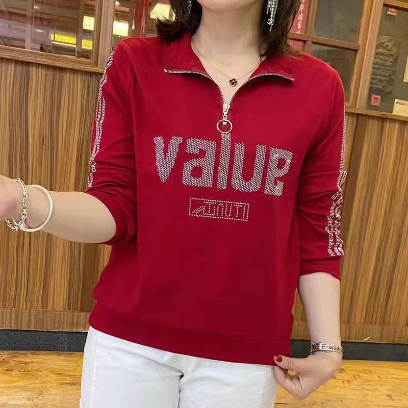 2025新款女装宽松上衣T恤春装半拉链领时尚长袖卫衣休闲百搭烫钻