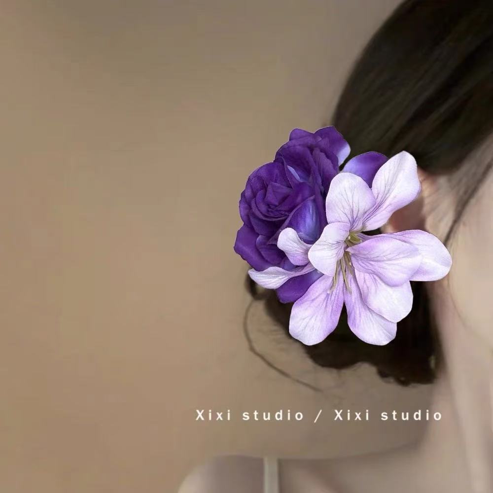 紫霞仙子 韵味紫色玫瑰花发夹女氛围感仿真花侧边夹头花发卡发饰