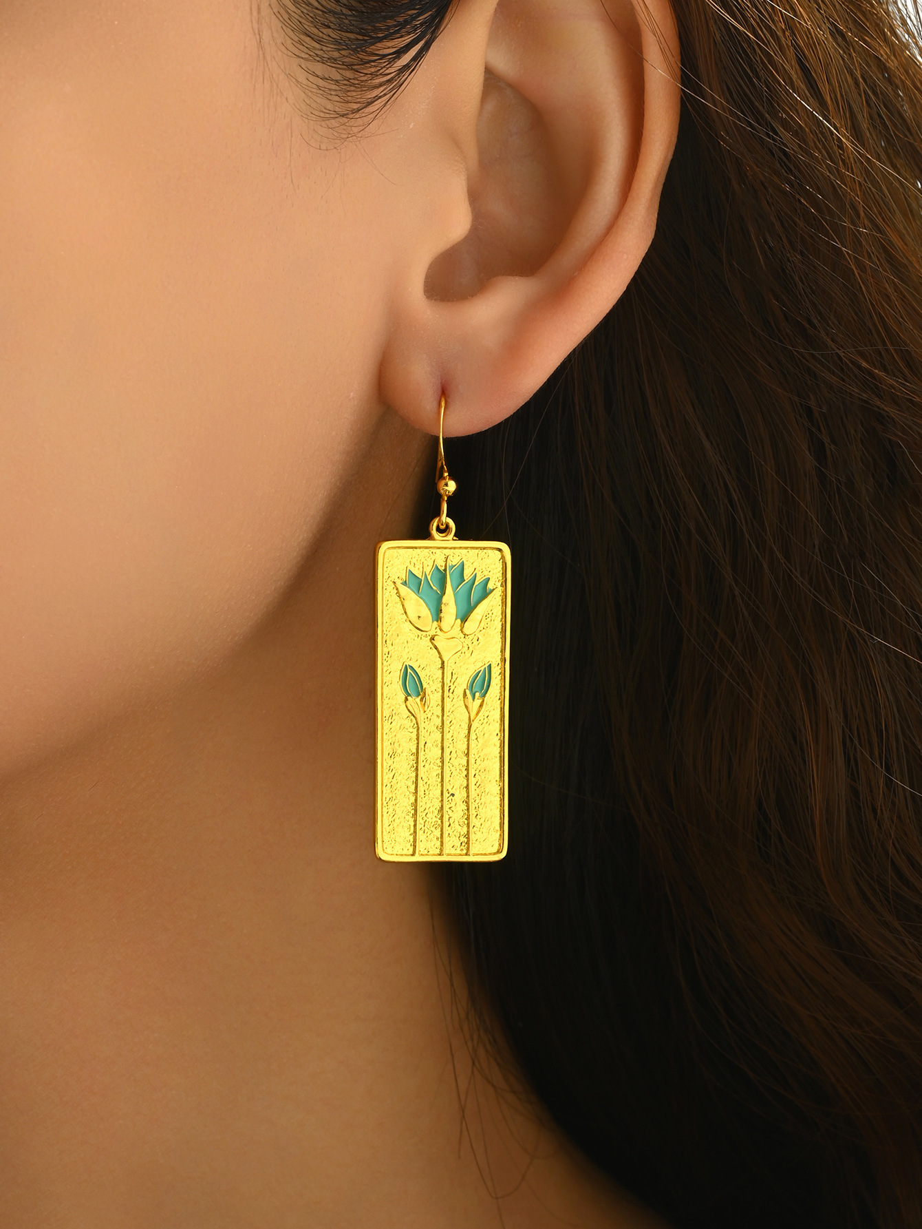 イネはクロスボーダーのレトロなイヤリングをしています。