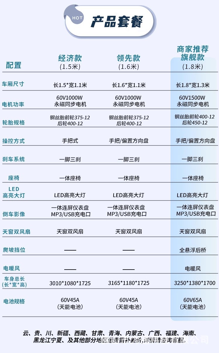 仕様 ネイキッドモデル 1.5m コンパートメント (バッテリーなし、送料無料),エコノミーモデル 1.5m台車(60V45A鉛蓄電池),高級モデル 1.6m コンパートメント (60V45A 鉛蓄電池),フラッグシップモデル 1.8mキャビン(60V65A鉛蓄電池)