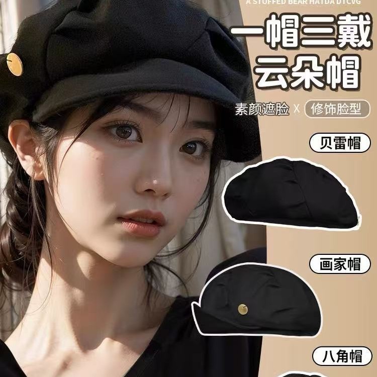 黒いベレー帽の女性の頭の周りの雲の帽子の春秋の新型は丸い顔に適しています。