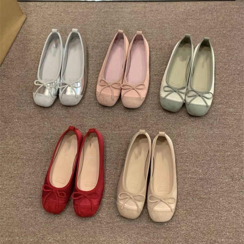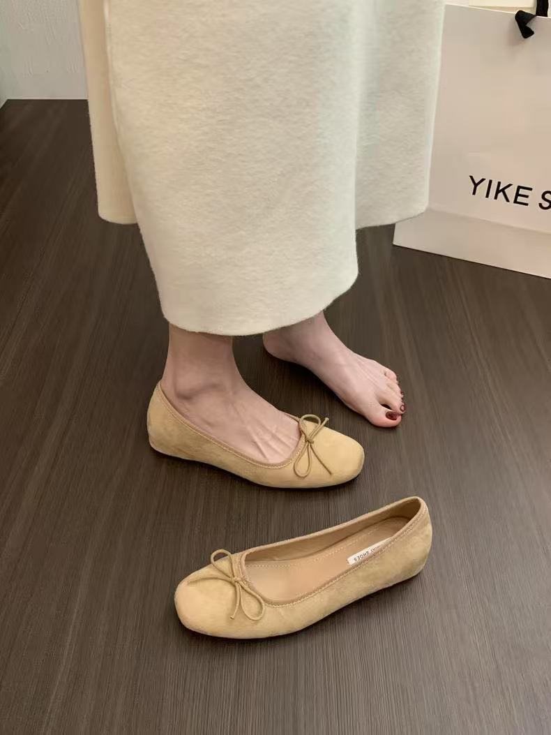 女性の春と秋の間に靴のスエードの顔の2025赤い新型の夜の靴のフランスのバレエの靴の蝶結びを増加します。