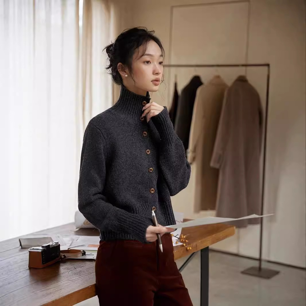 新しい秋冬にウールの高襟ニットセーターのカーディガンにショートコートのセーターの女性を合わせます。