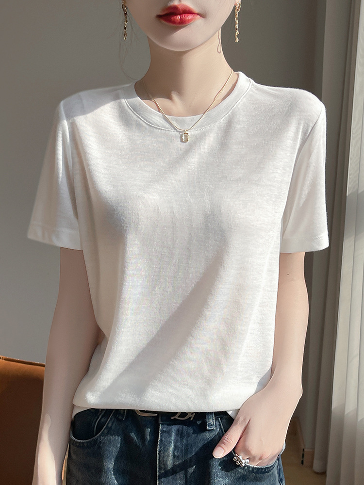 テンセルリヨセル半袖 Tシャツレディースラウンドネック無地カジュアル気質トップ半袖ボトムメーカー卸売婦人服