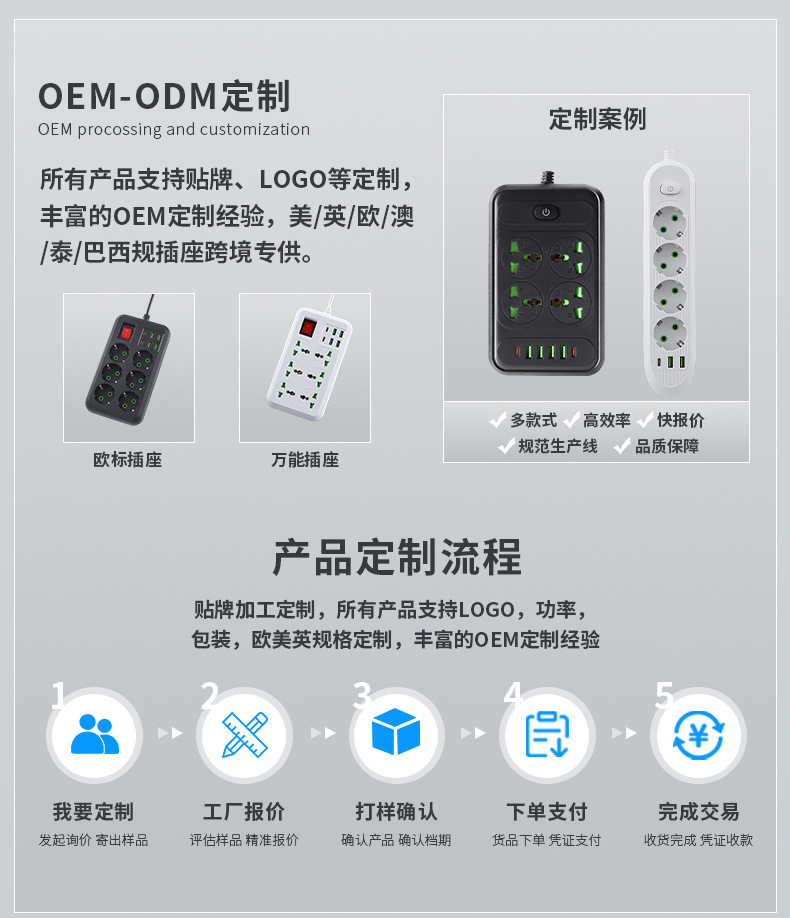 广州市卓为家用电器有限公司拥有超过10年的专业生产和制造经验,拥有近100名员工,工厂面积5000平方米,位于广东普宁,是一家现代化的专业企业,专注插座、转换器、插座台灯等电器产品的研发、生产、销售和服务于一体。工厂私有模具100余套,款式规格300多种,工厂专业设备配套齐全,独立自主生产管理,处于同行领先水平,致力于为公众创造一个更加安全的用电环境。自成立以来,公司始终坚持“以人为本、诚信为本”的经营方针,始终把“质量保证、专业服务、客户满意”作为企业的宗旨。产品出口国家众多,为客户量身定制,支持OEM、ODM等不同需求的定制和代工服务。欢迎您到厂参观,我们愿意成为您最可靠的长期合作伙伴。