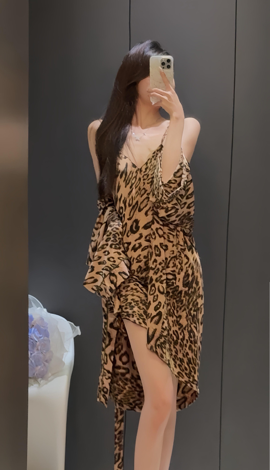 セクシーなヒョウ柄の胸のパッドの新型レースの眠りのスカートの夏の2つのセットの家庭服の薄いタイプの氷糸のストラップのパジャマ
