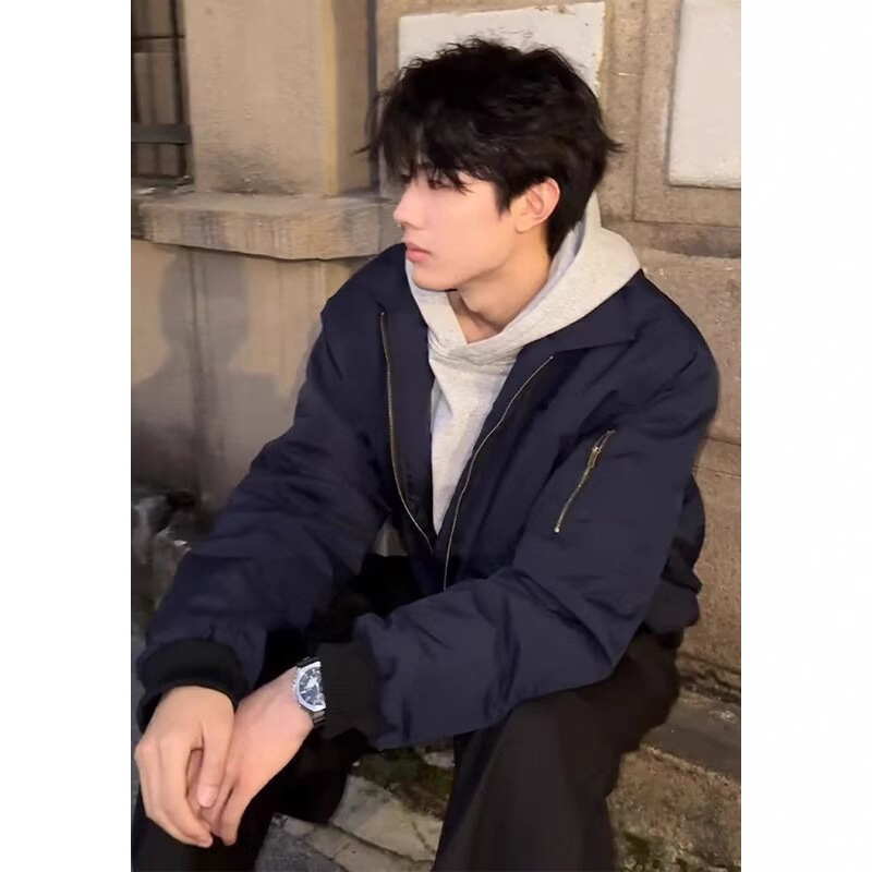 藏青色美式飞行员夹克男纯色春秋季高级感痞帅翻领外套痞帅棒球服