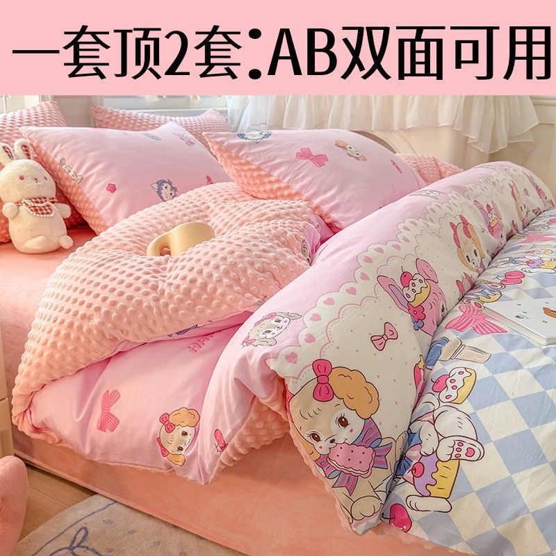 漫画かわいいスタイルタオル刺繍洗い綿ベッドシーツ4点セット、掛け布団カバー、寮用掛け布団カバー、ボックスシーツ3点セット