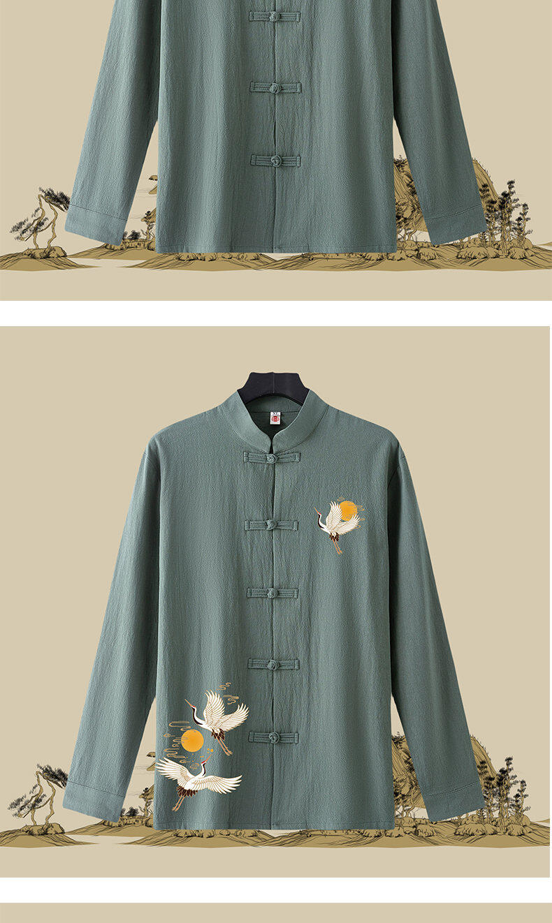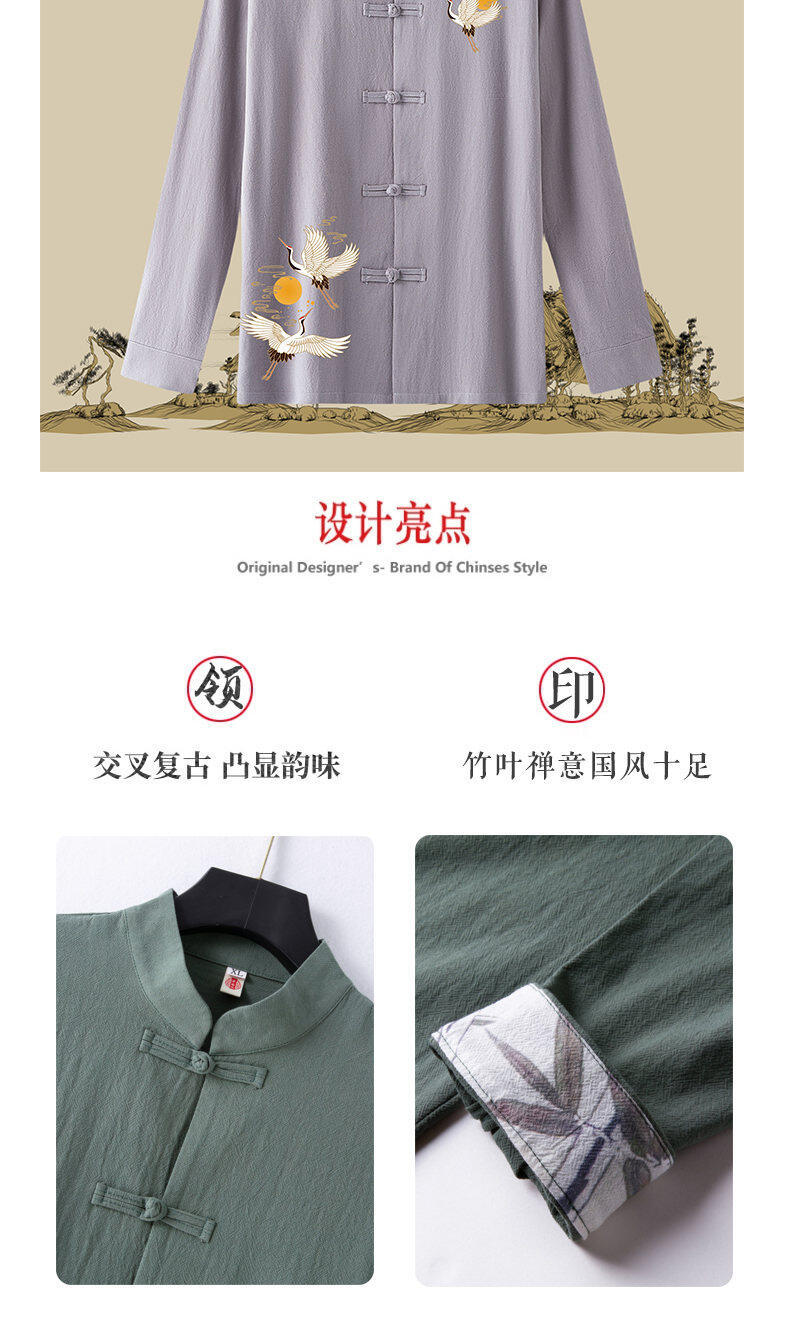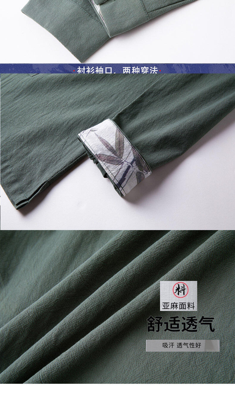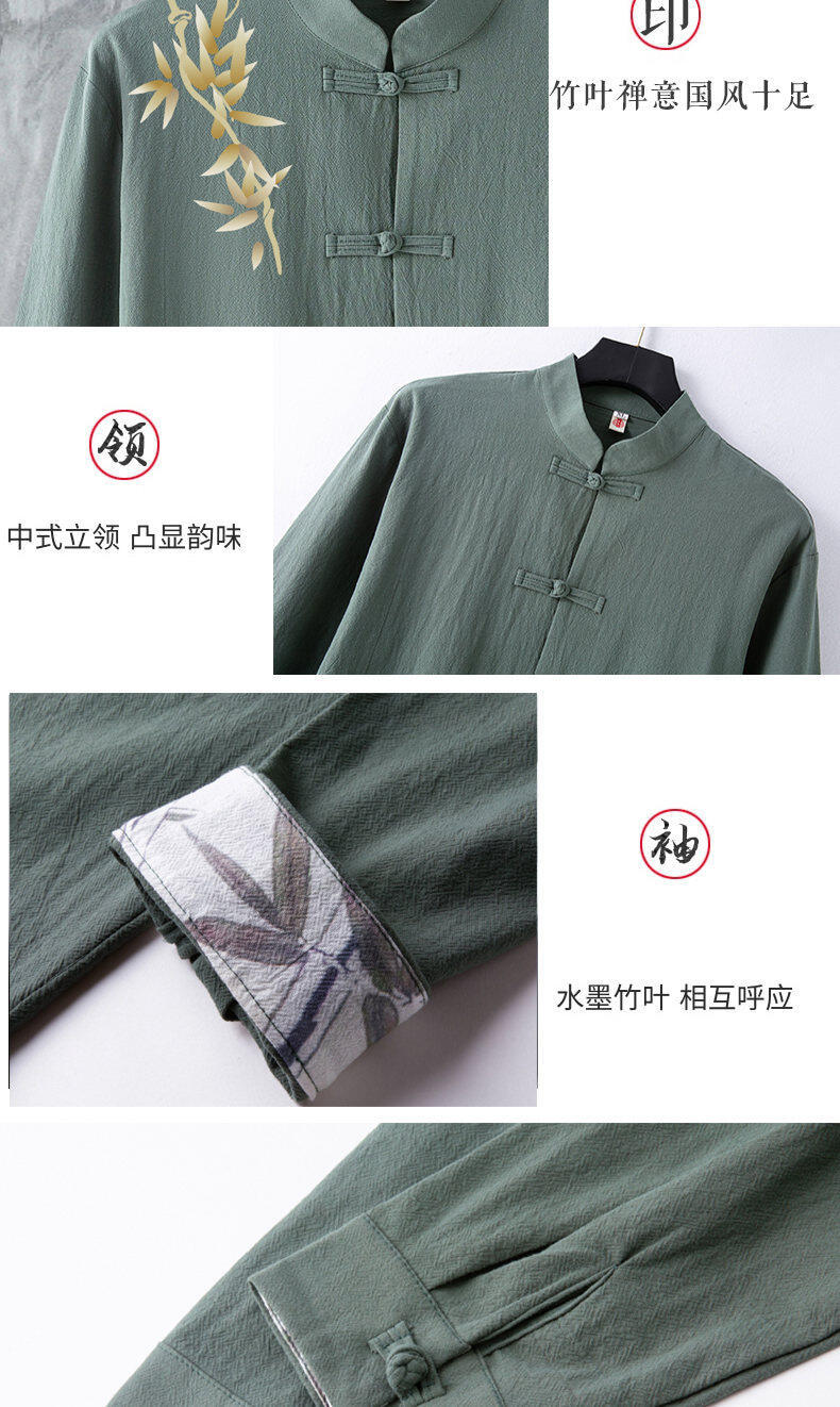 春と秋の新中国風のレトロな紳士服中国風のリネンシャツメンズ長袖コットンとリネンのボタンダウンシャツスタンドカラータングスーツ