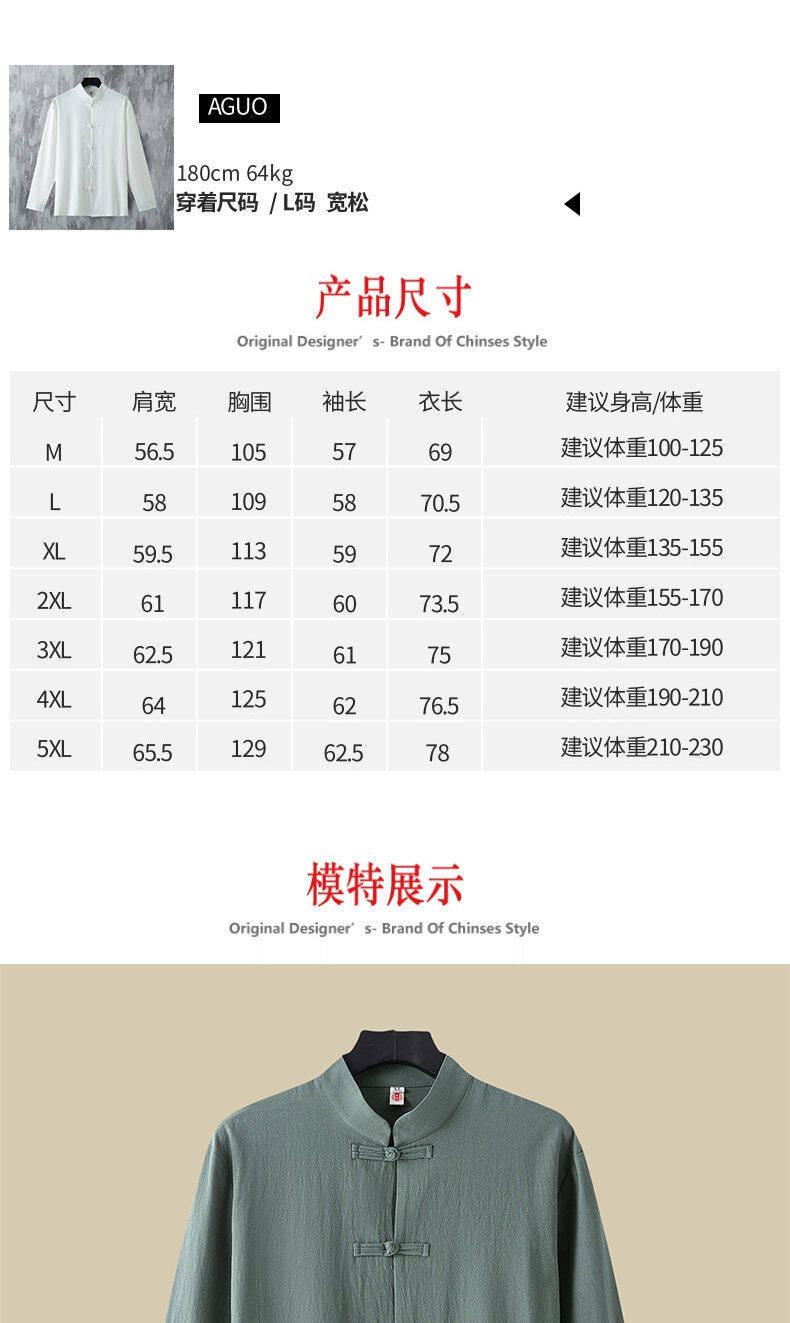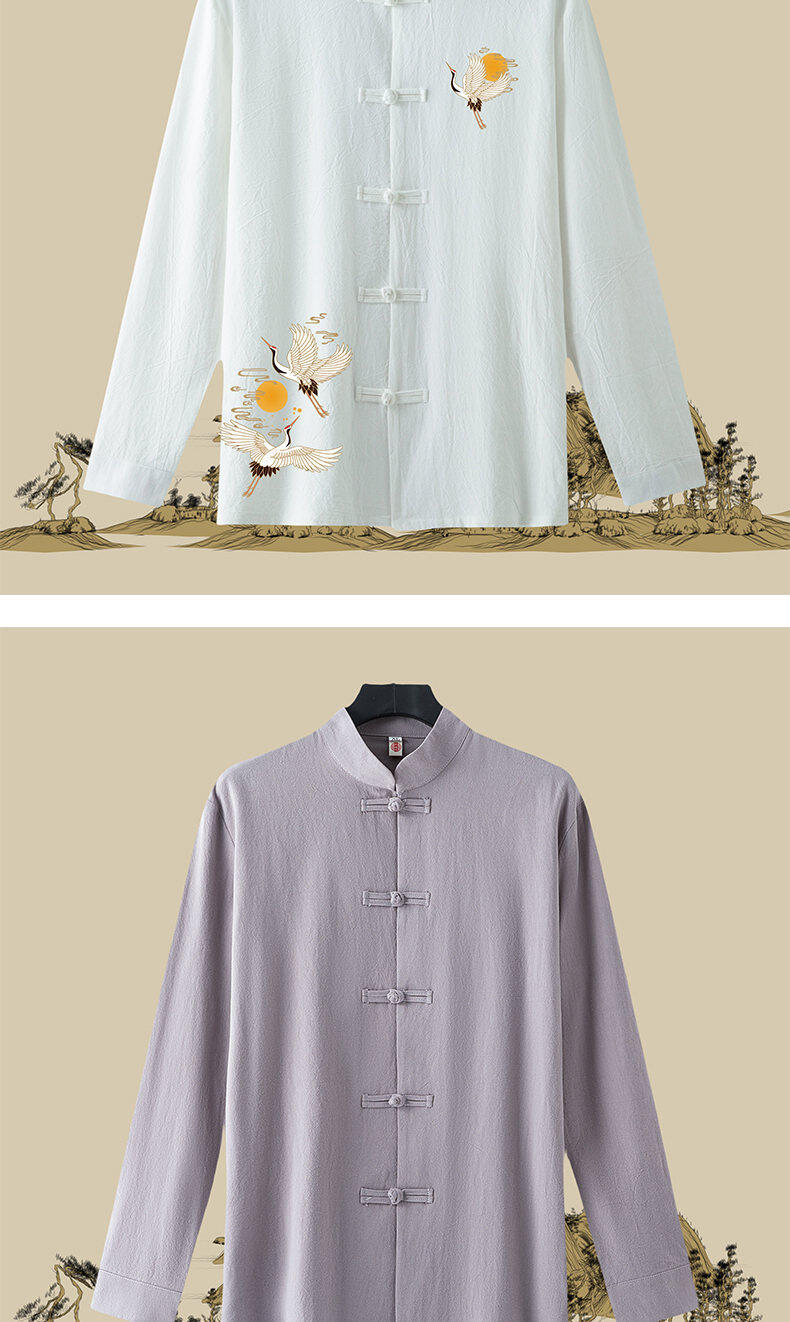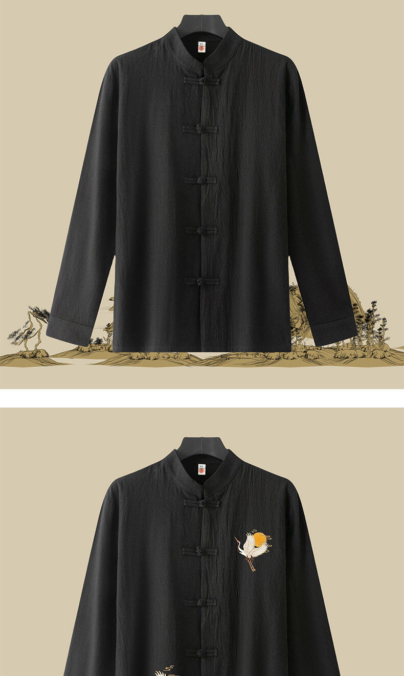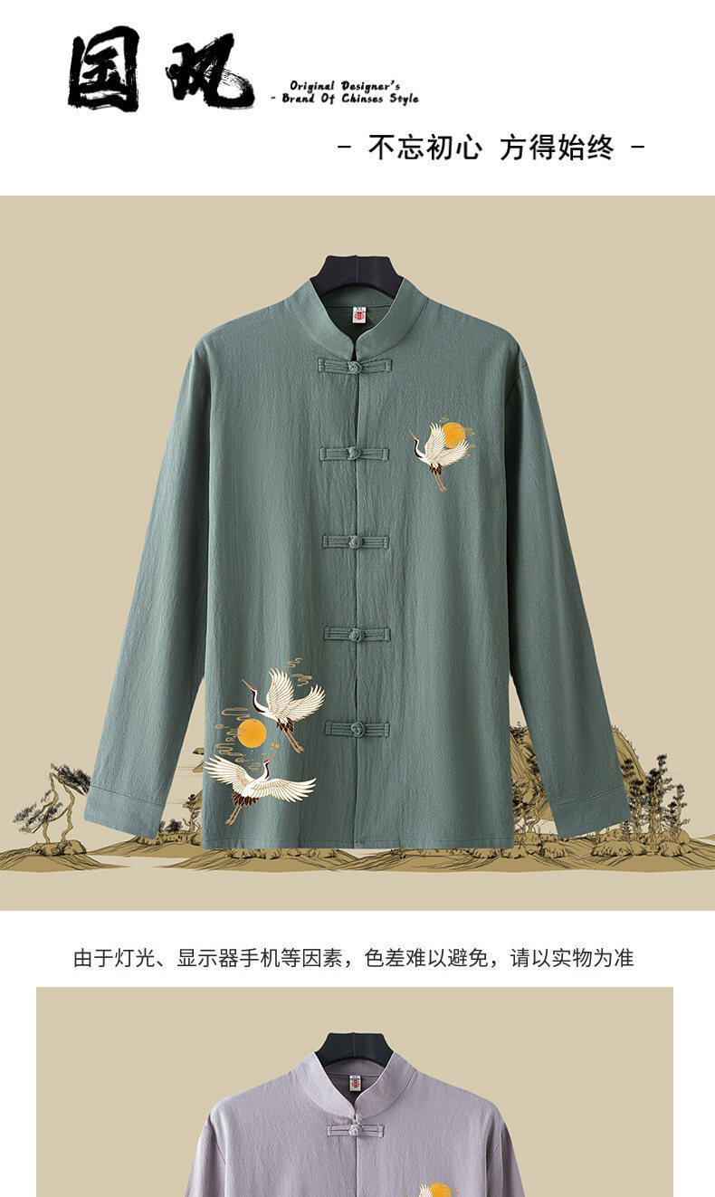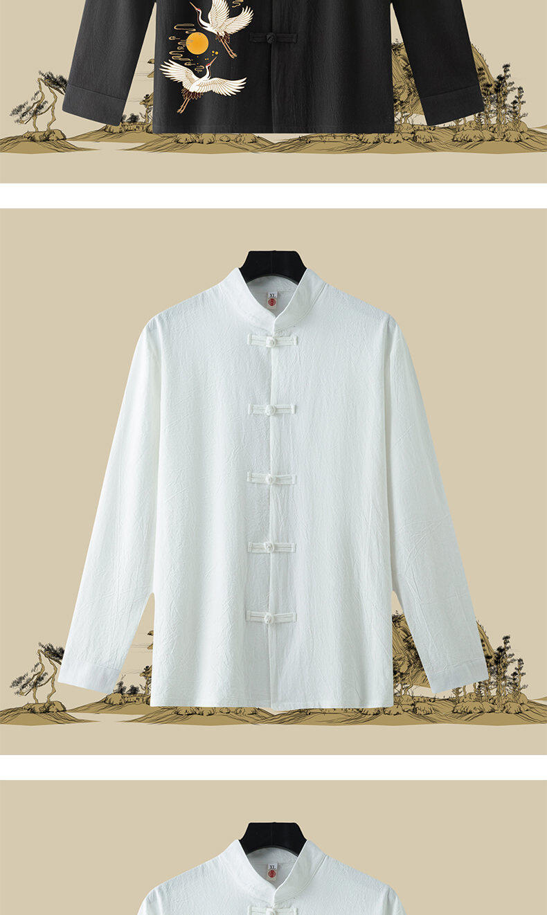 春と秋の新中国風のレトロな紳士服中国風のリネンシャツメンズ長袖コットンとリネンのボタンダウンシャツスタンドカラータングスーツ