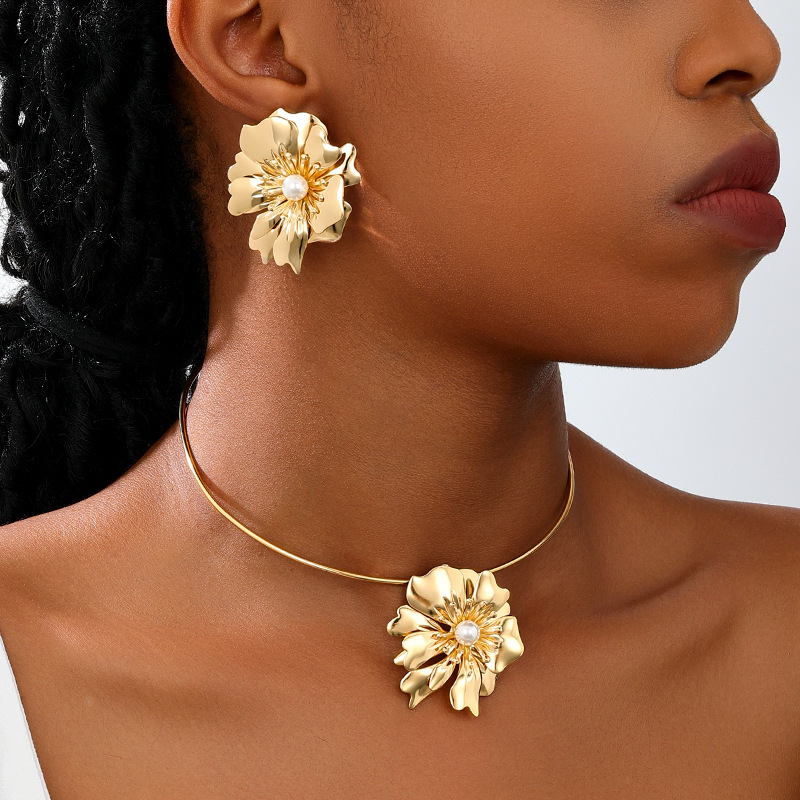 1套欧美跨境时尚夸张那个花朵金属金色首饰套装适合女士度假佩戴