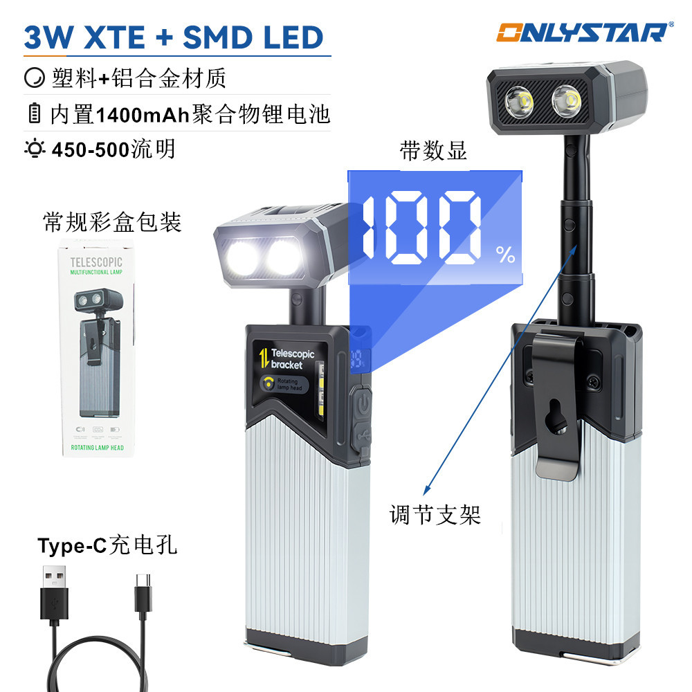 新款伸缩旋转磁吸工作灯户外露营多功能检修拉伸手持充电手电筒