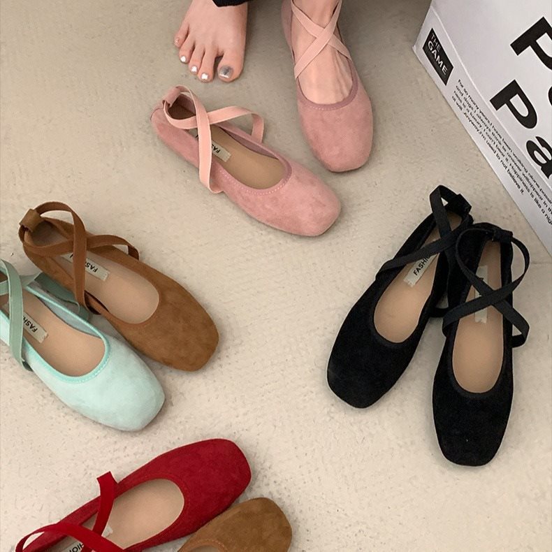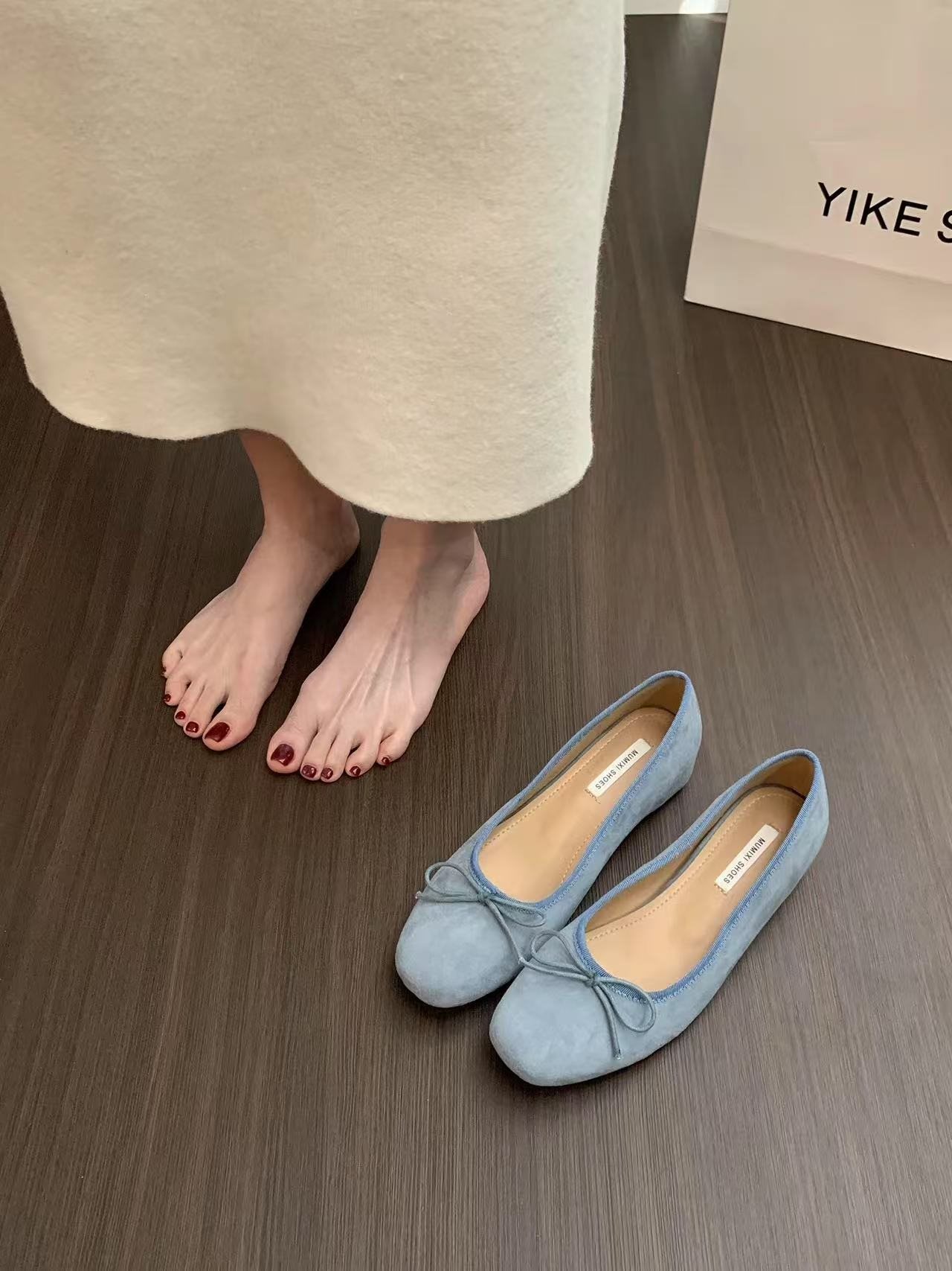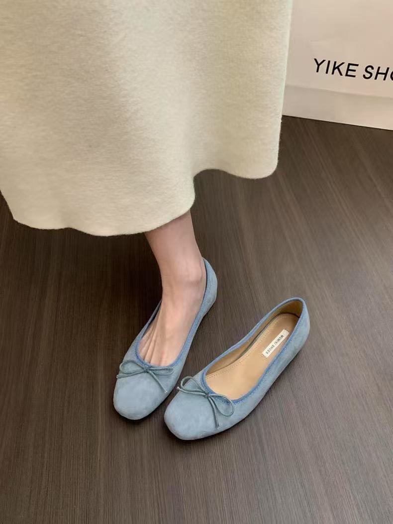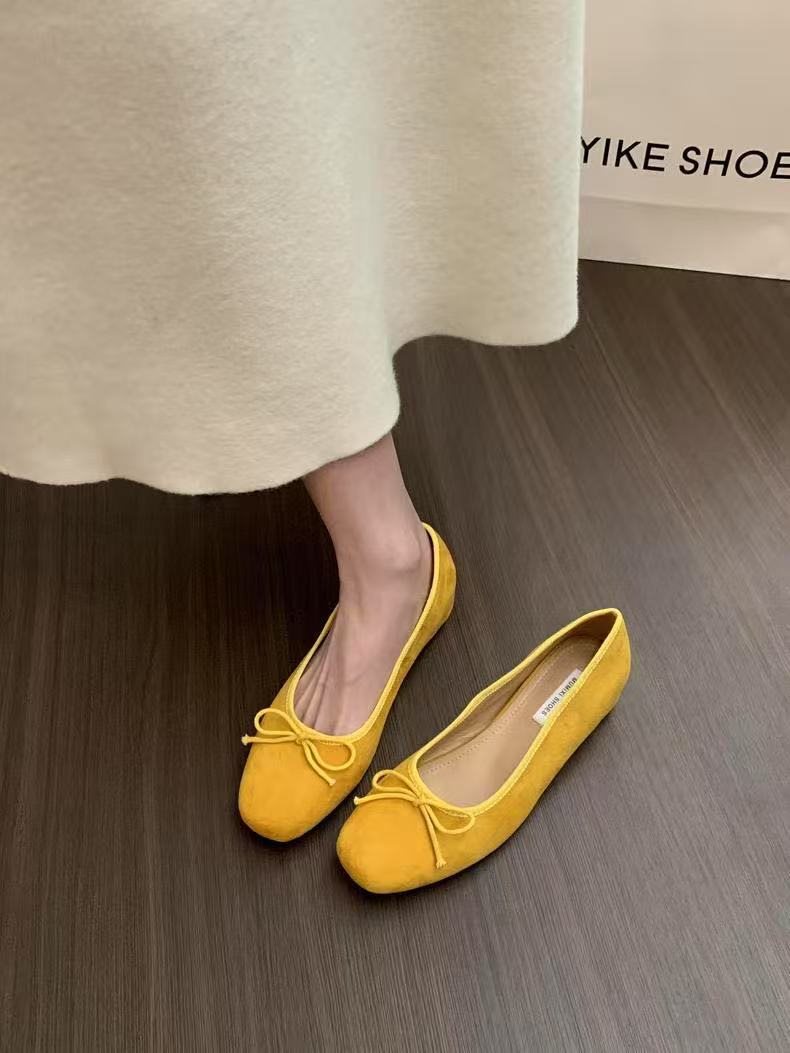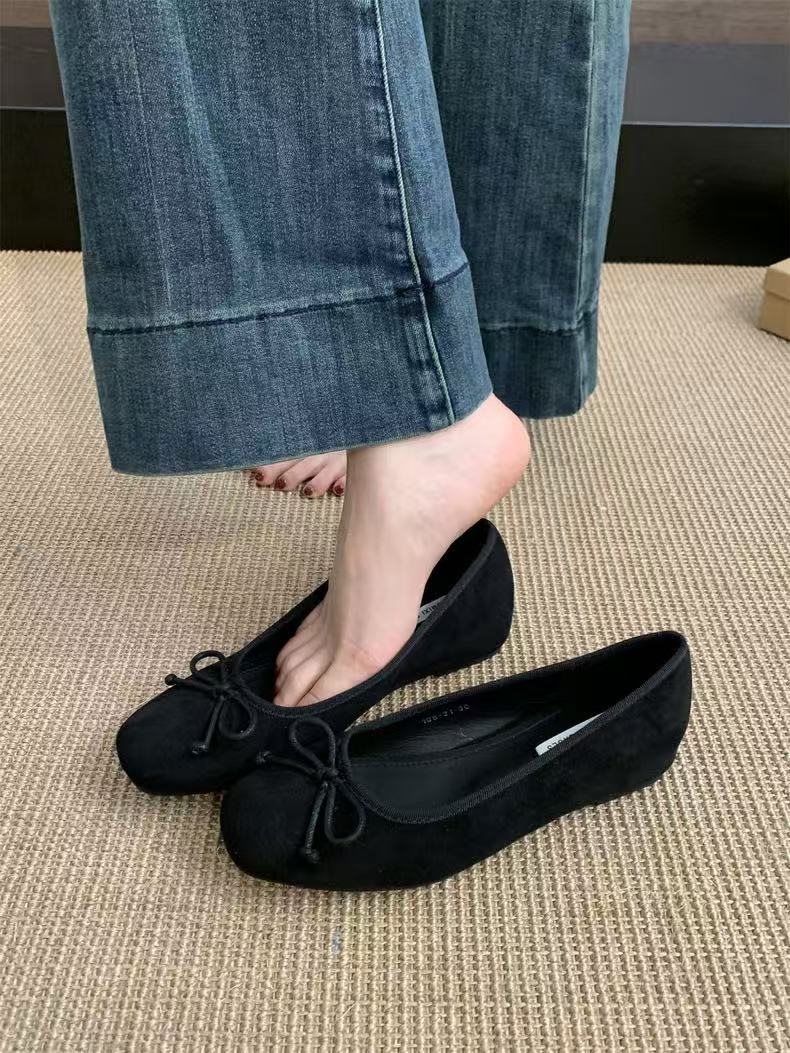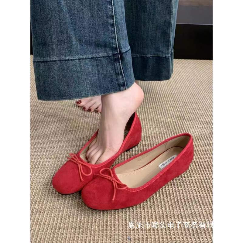 女性の春と秋の間に靴のスエードの顔の2025赤い新型の夜の靴のフランスのバレエの靴の蝶結びを増加します。