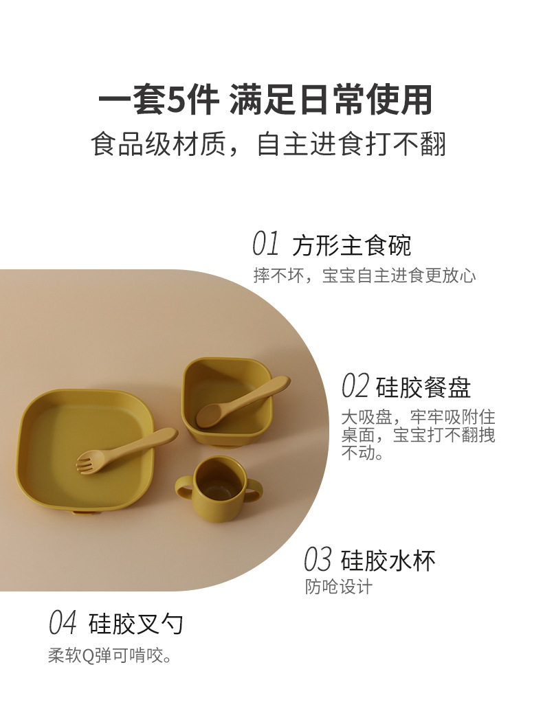 食品グレードのシリコン食器セット、子供用正方形プレート、ボウル、カップ、フォーク、スプーン、4点セット、壊れない、火傷防止ディナーウォー