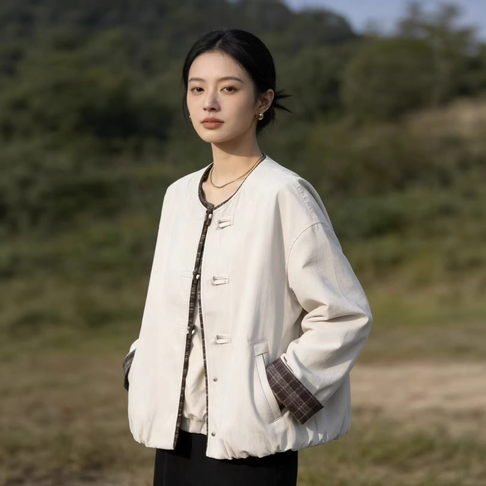26年春款外套女拼接格子宽松休闲外套短款上衣圆领牛角扣外套上衣