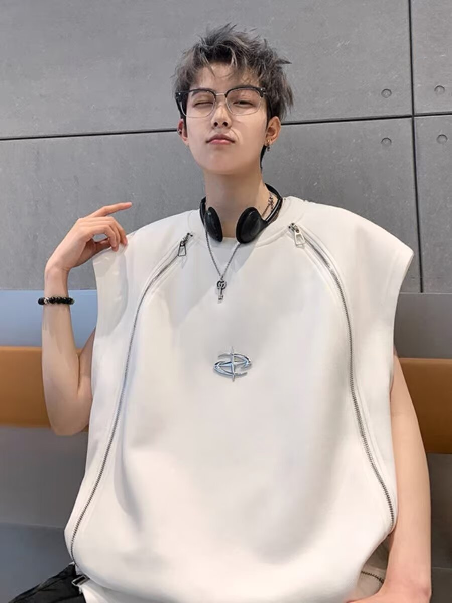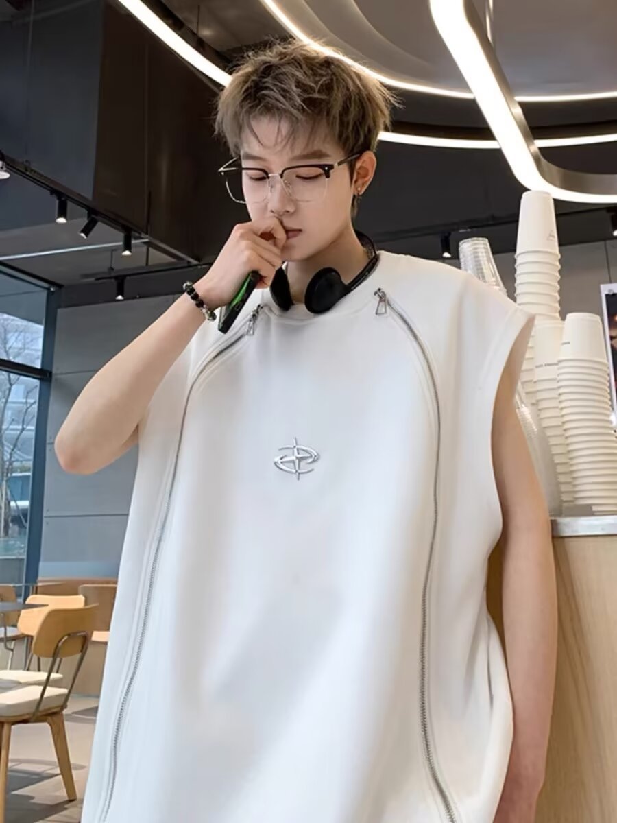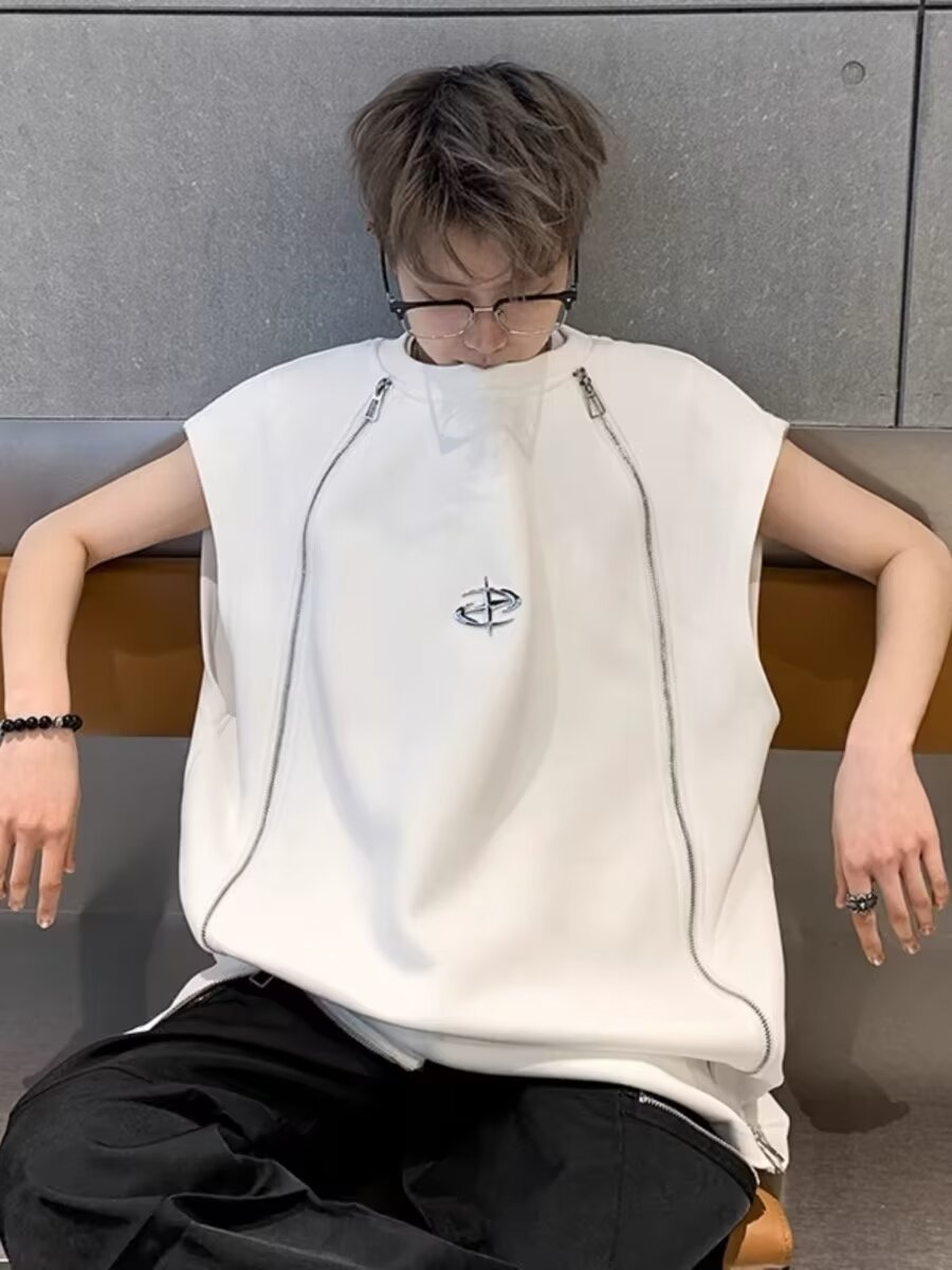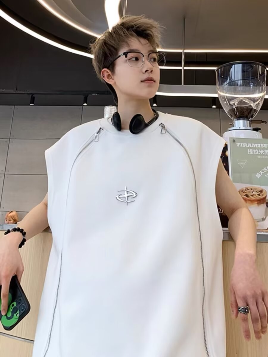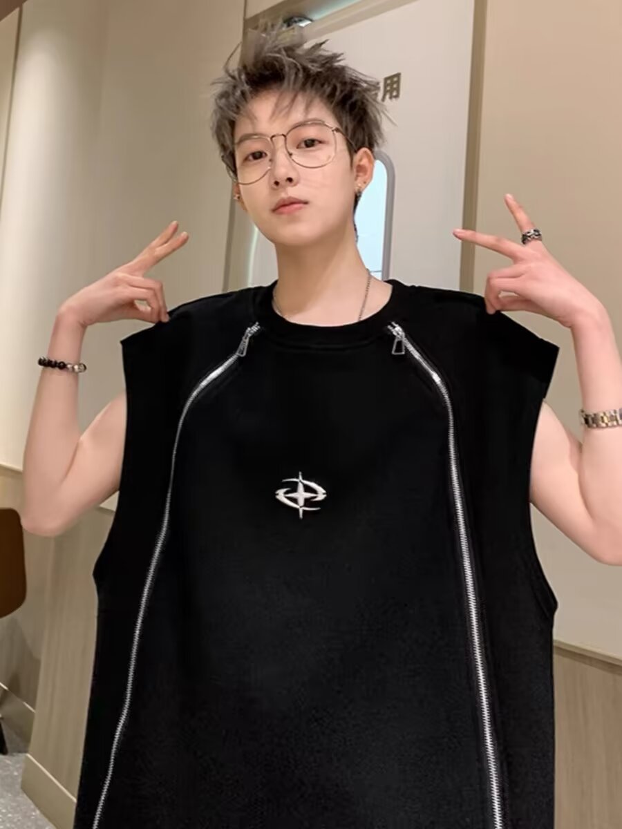 ベスト男性2025夏の新型ファスナー金属デザイン感アメリカ重ポンド潮牌ゆるいカジュアル袖なしtシャツ
