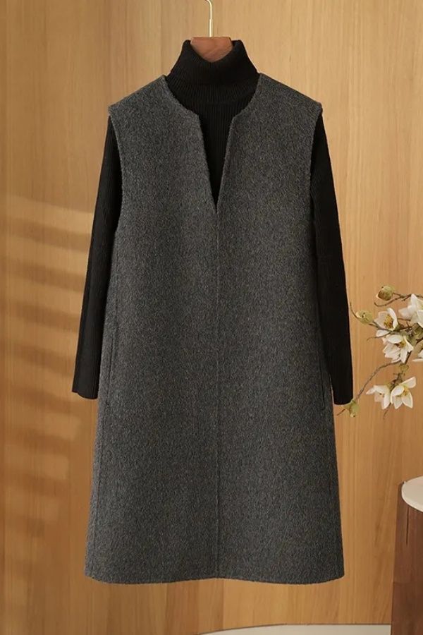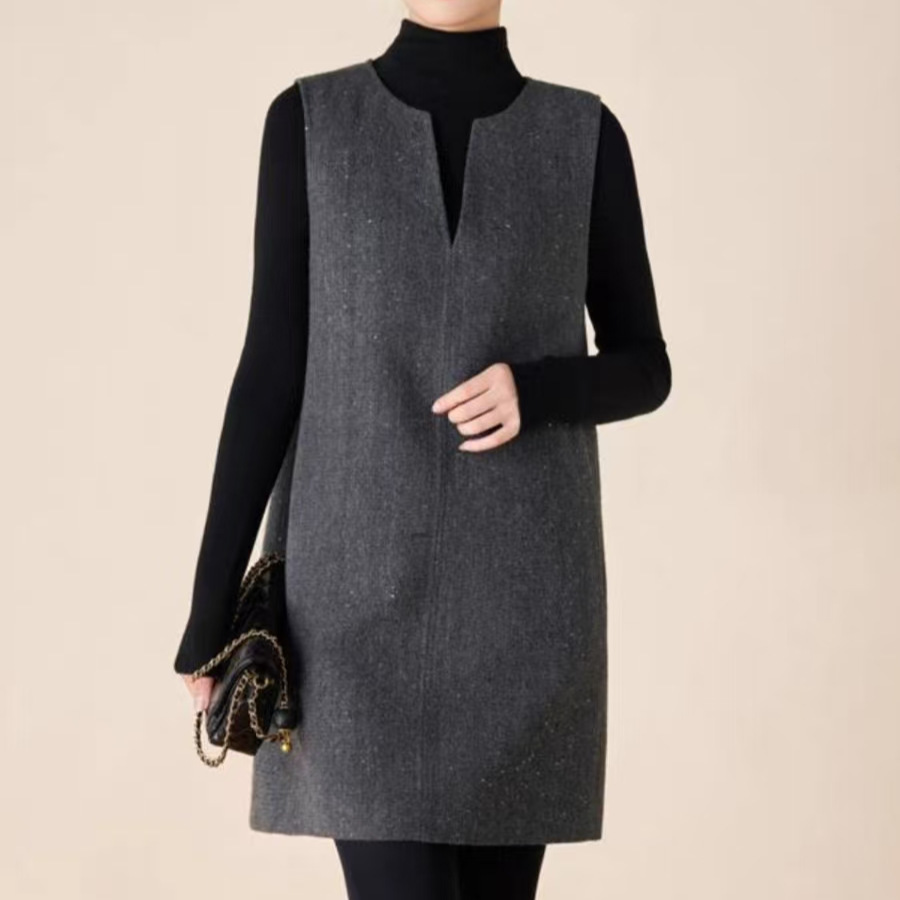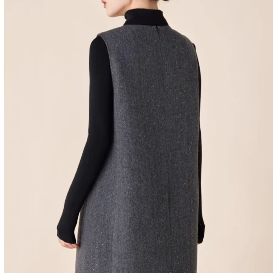 フレンチスタイルのヘップバーン風Vネックウールグレーワンピース レディース 秋冬新作2025 ノースリーブ エレガントベストワンピース