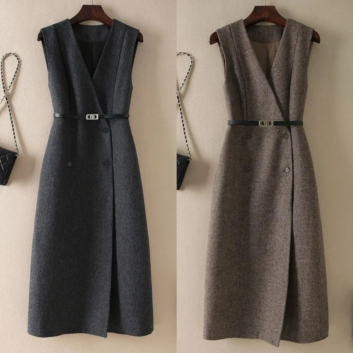 新款呢料背心气质高级无袖通勤中长小香风马甲收腰长裙(带腰带)