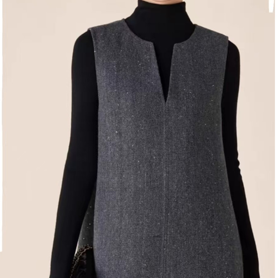 小香風馬甲ワンピース2025冬の中長のa字スカートの女性毛はベストスカートvネック-518項灰