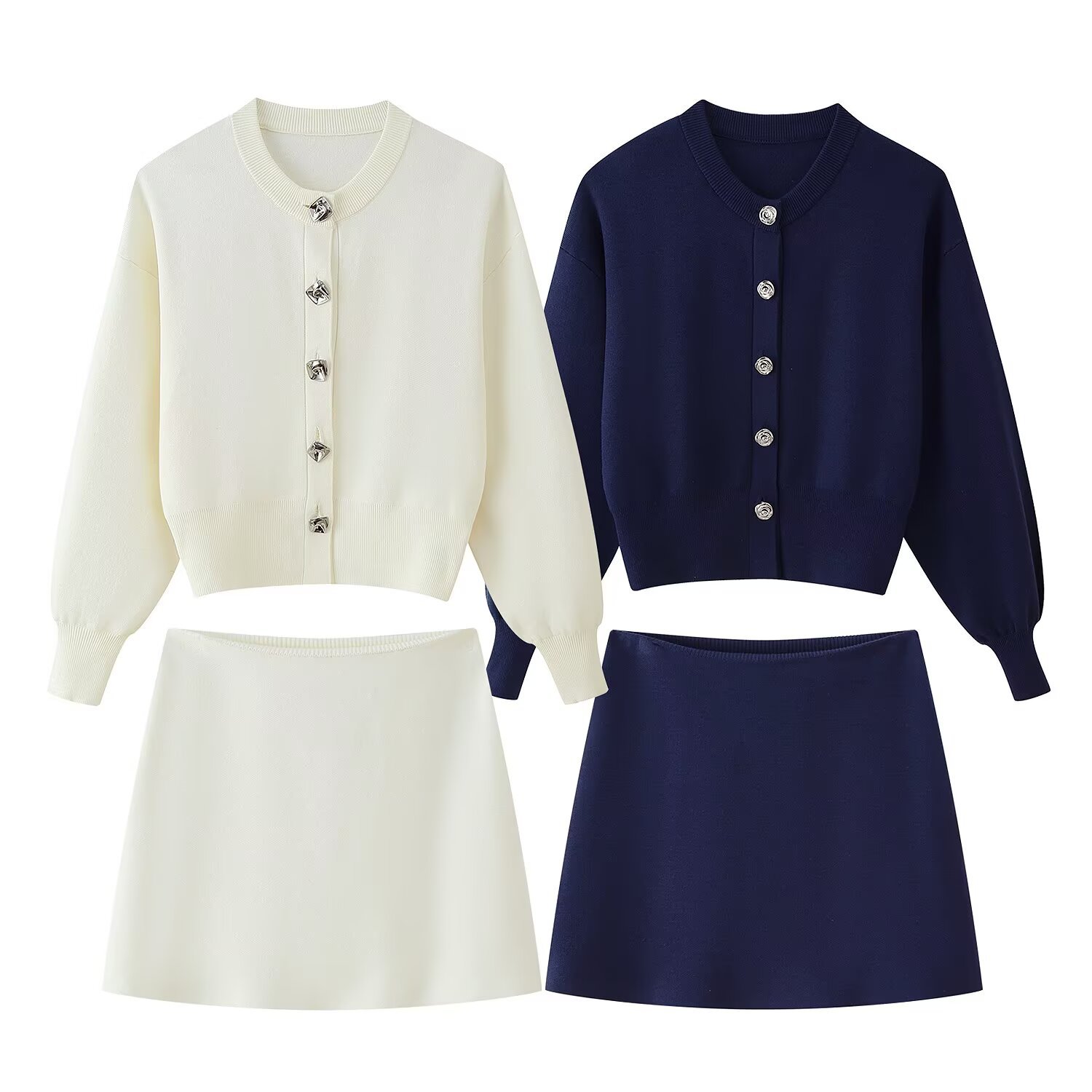 クロスボーダー卸売り欧米ファッションボタン飾りニットコート高腰ミニ半身スカートセット女性b 88814