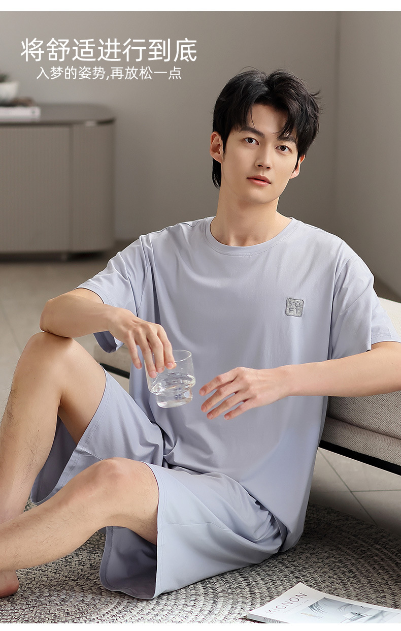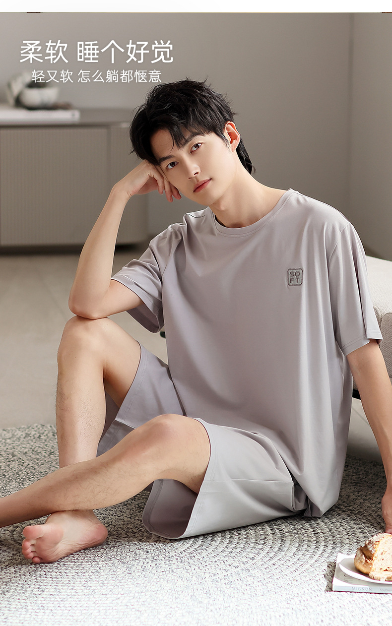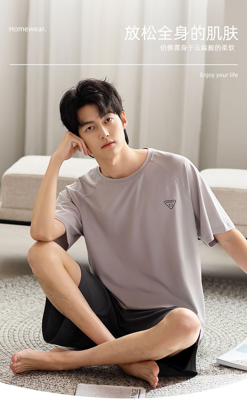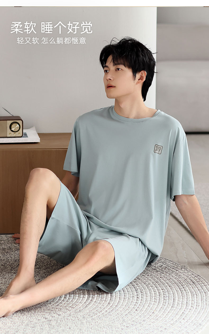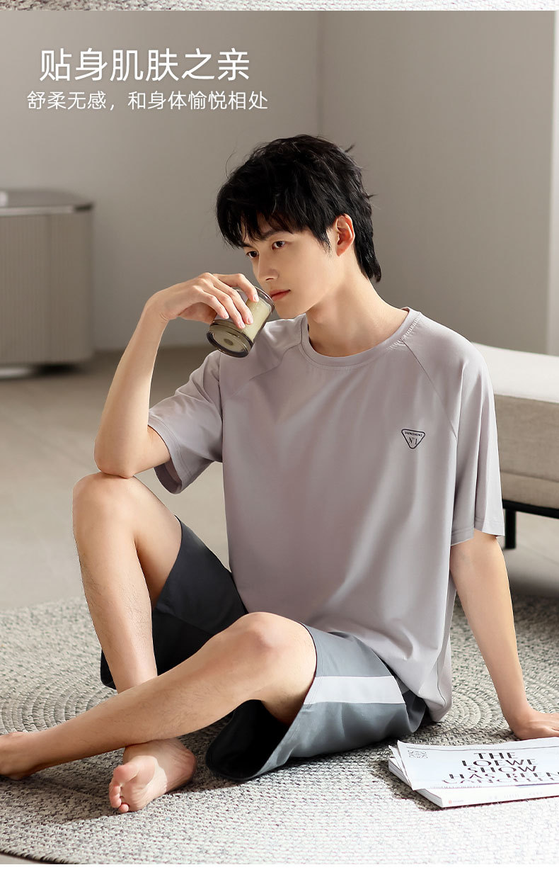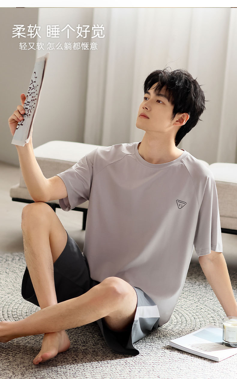青少年パジャマ男性夏の薄い半袖半ズボン夏の涼感学生純色の大きいサイズの家庭服セット