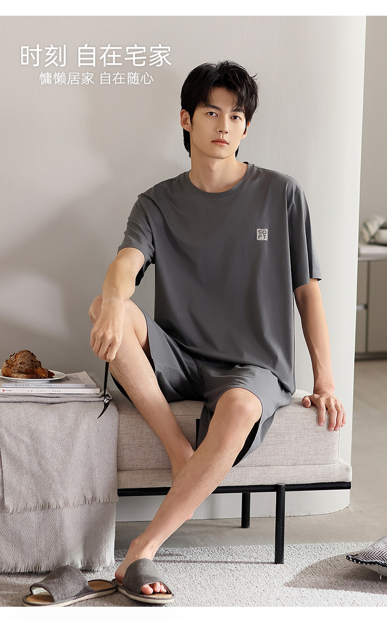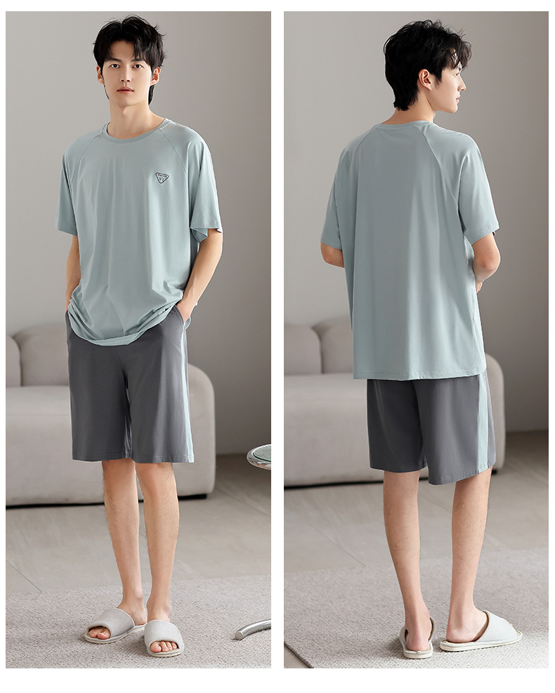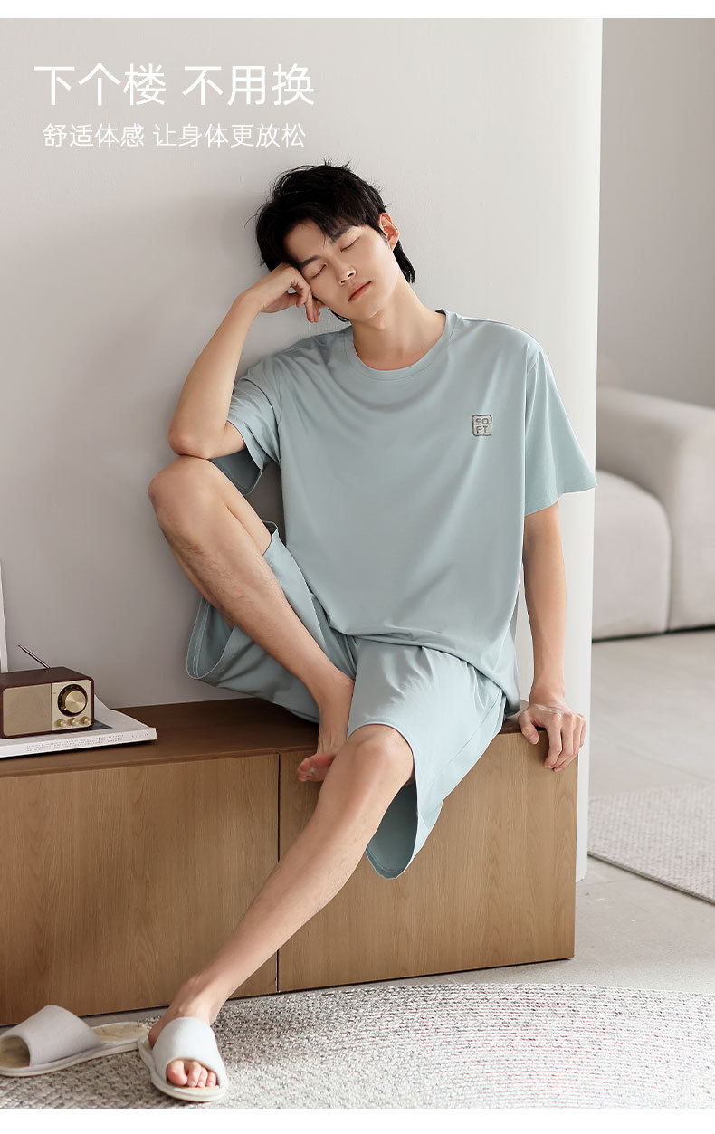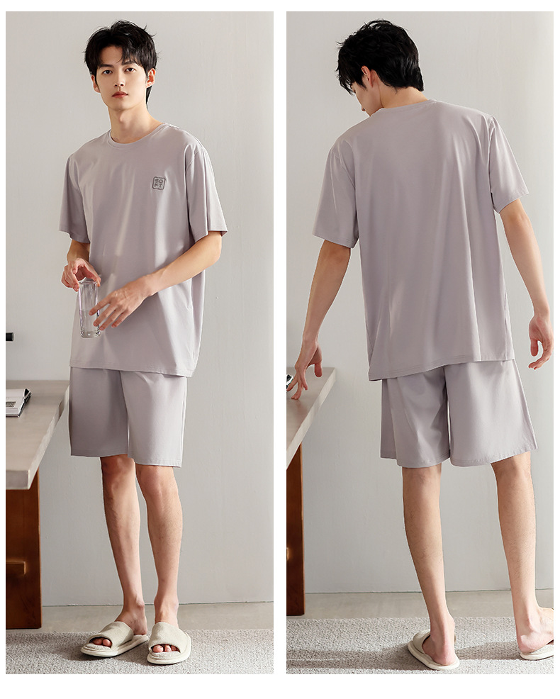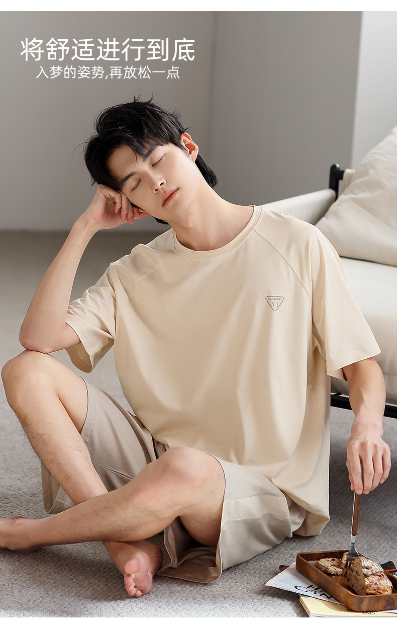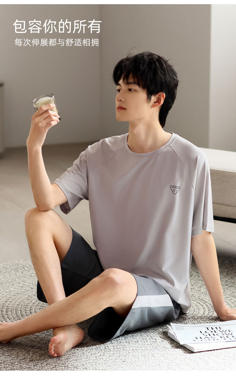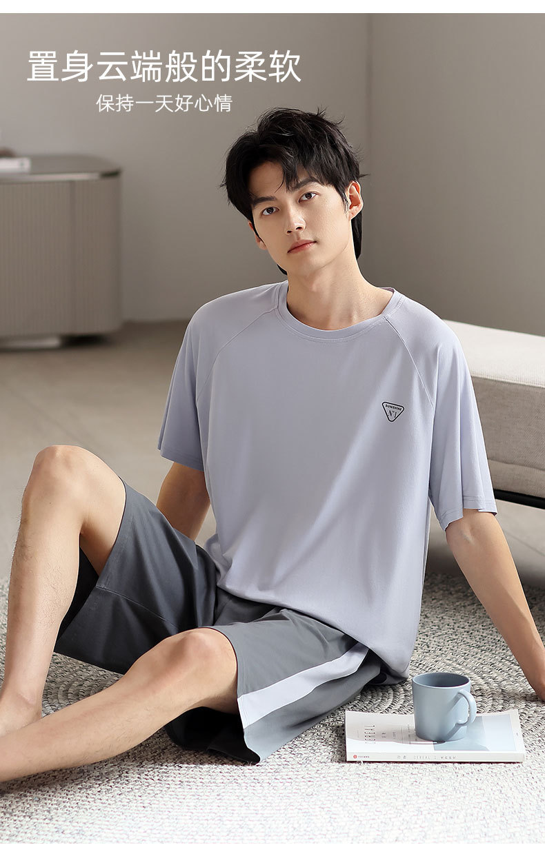 青少年パジャマ男性夏の薄い半袖半ズボン夏の涼感学生純色の大きいサイズの家庭服セット