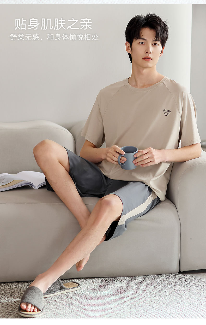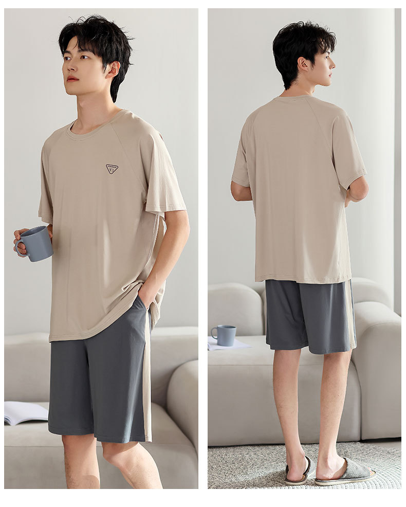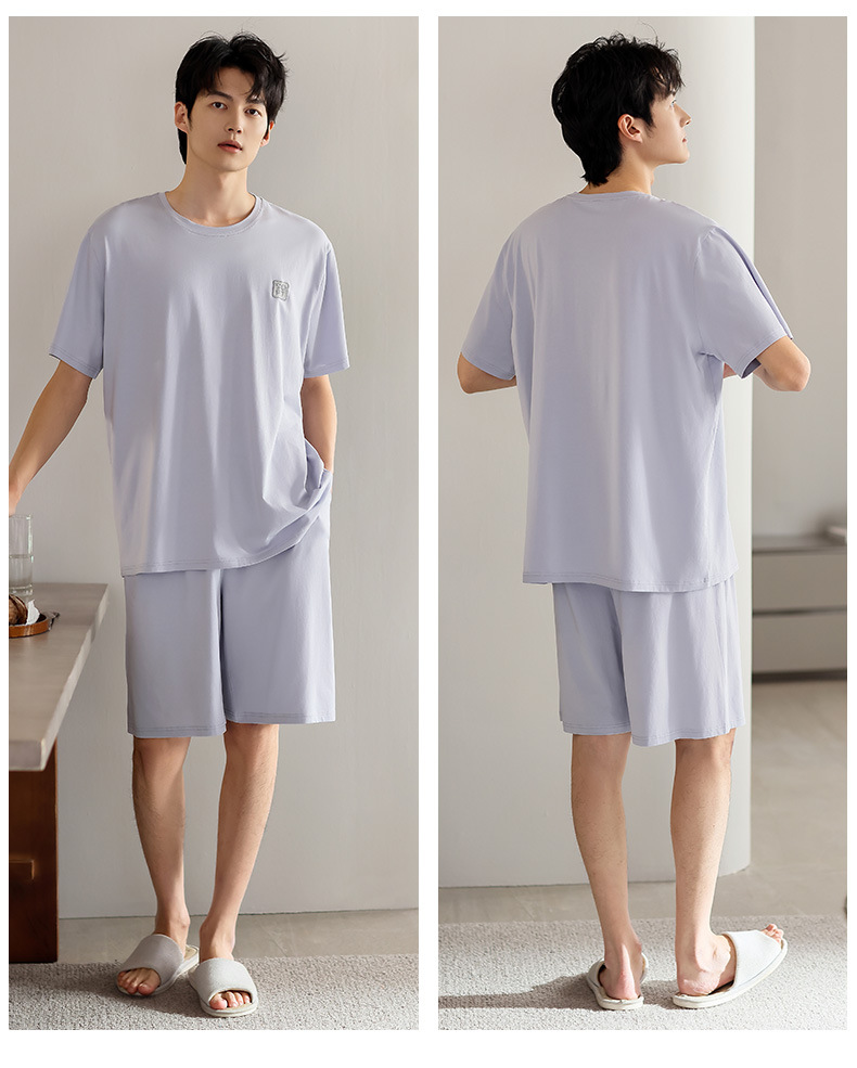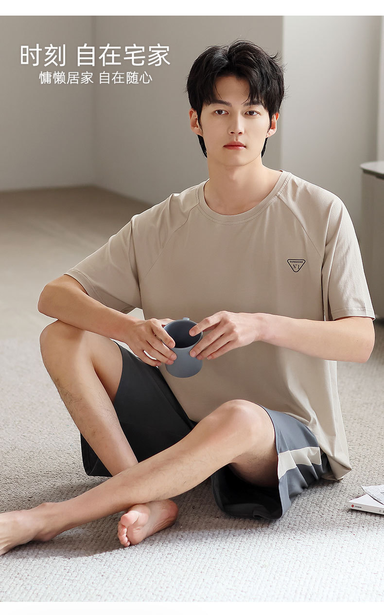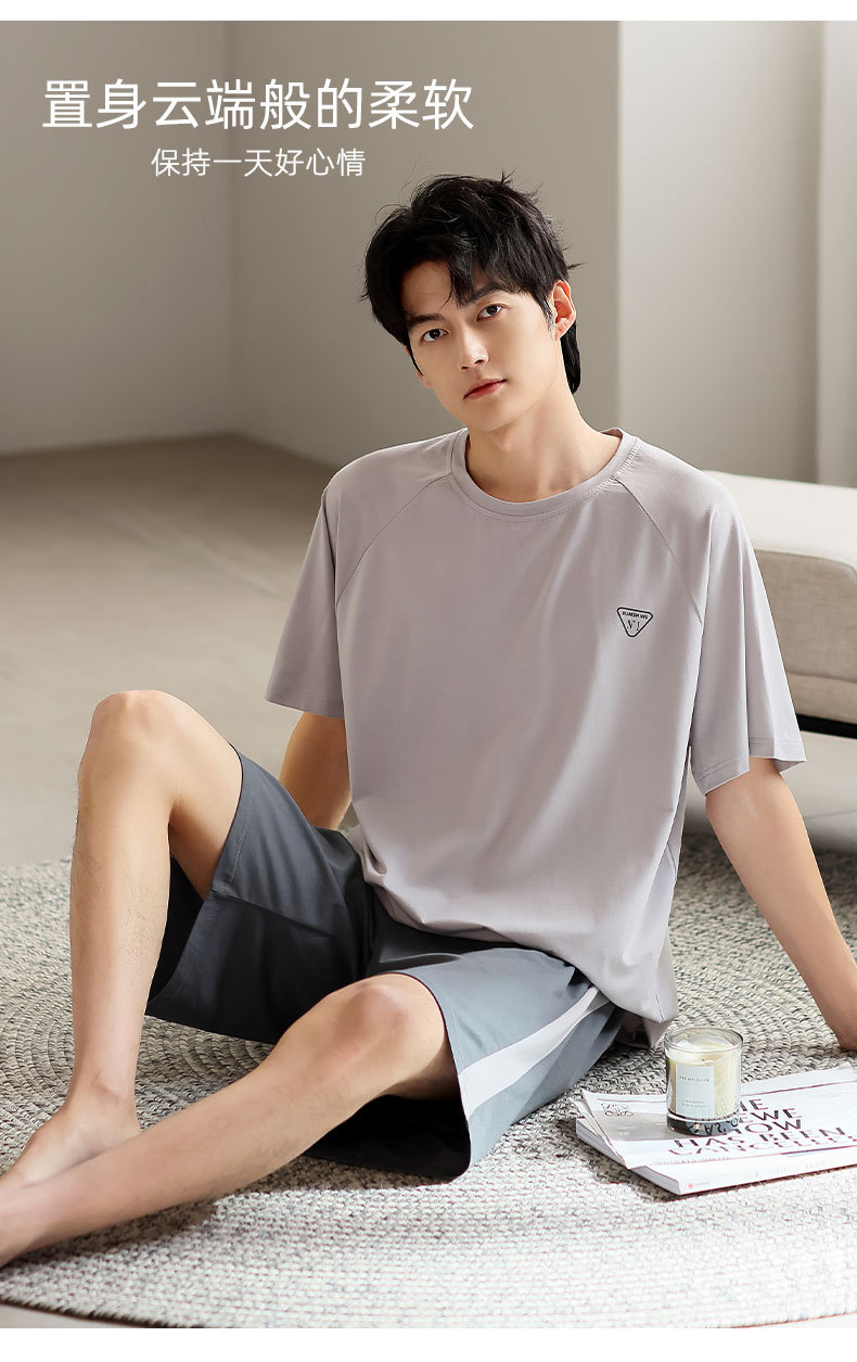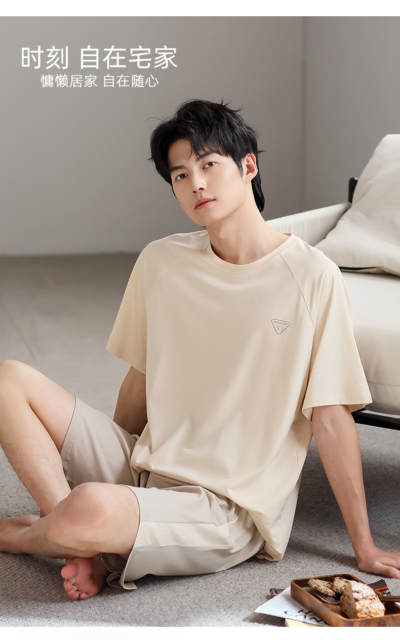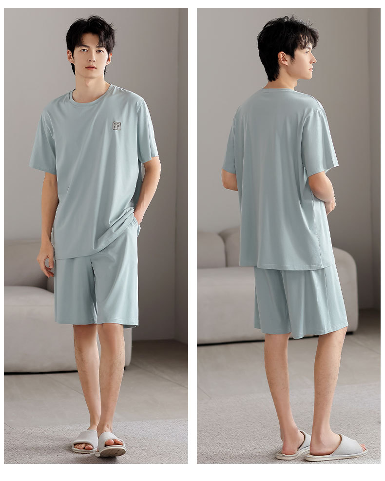 青少年パジャマ男性夏の薄い半袖半ズボン夏の涼感学生純色の大きいサイズの家庭服セット