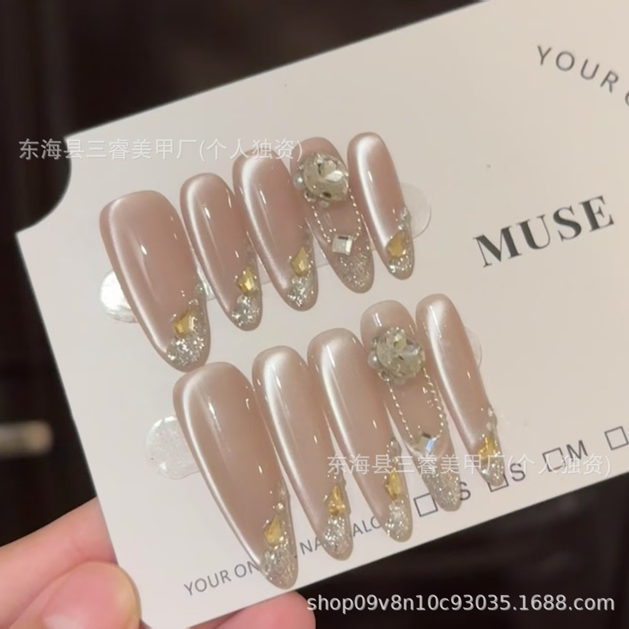 新しい金箔シャネル純粋な手作りのウェアラブルネイルヌードピンクキャットアイ爆発的な光沢のあるダイヤモンドライト高級気質美白取り外し可能なマニキュア