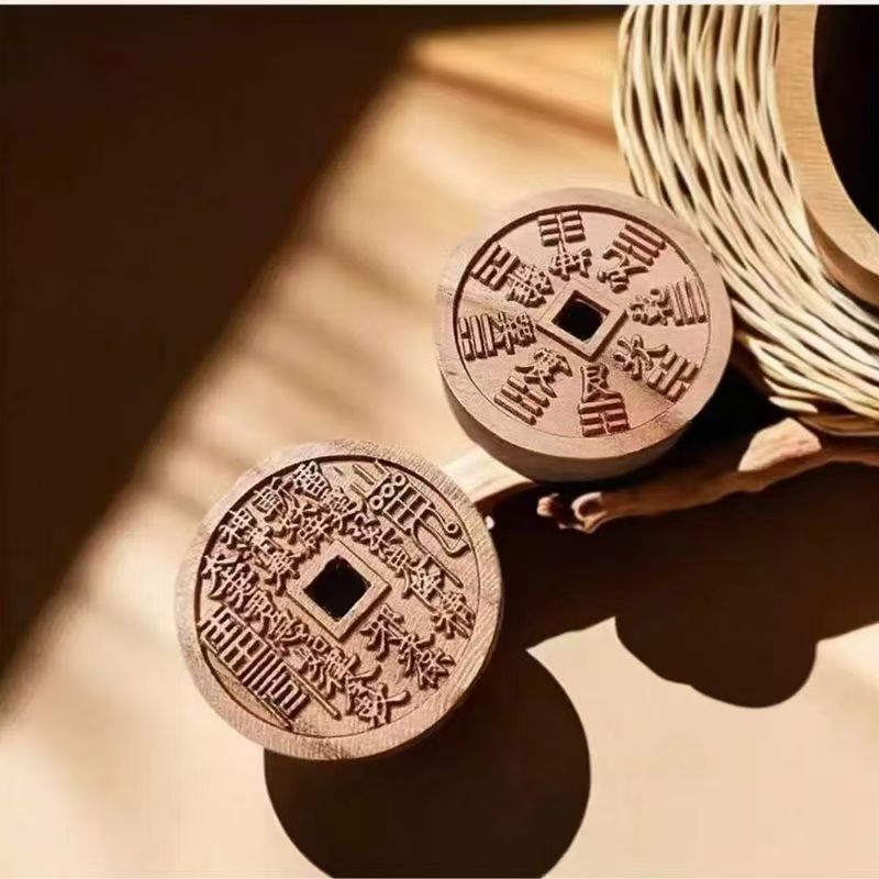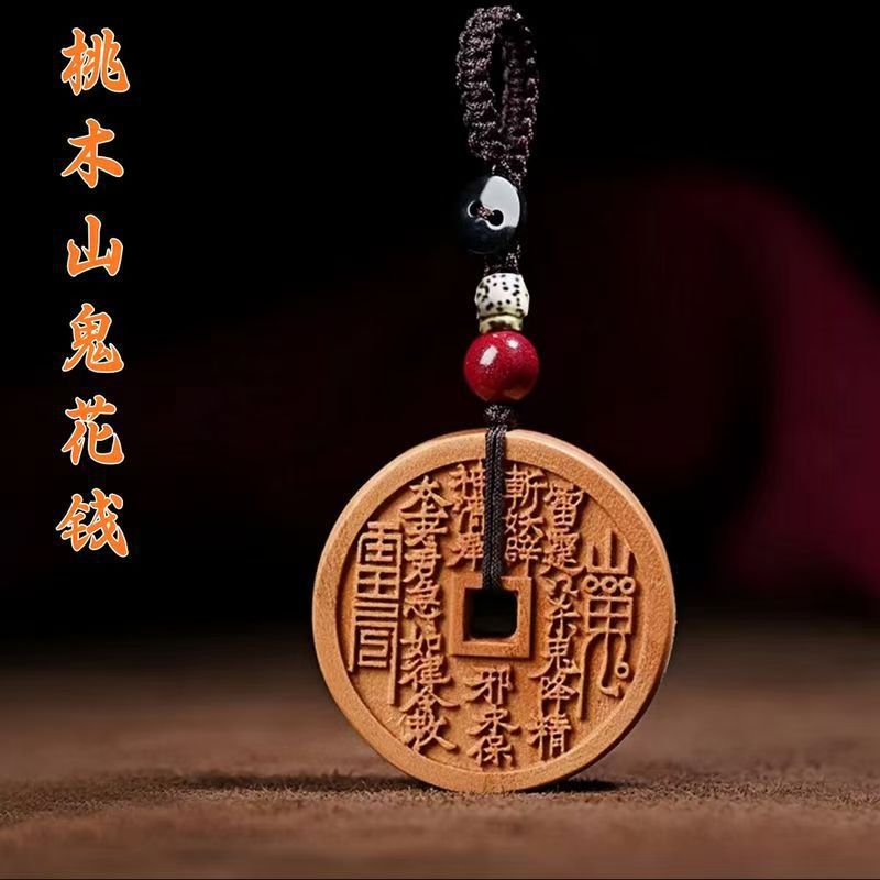 桃木山鬼はお金を使って無事にストラップを掛けて古い材料の手作りの木製工芸品のハンドルを身につけます。