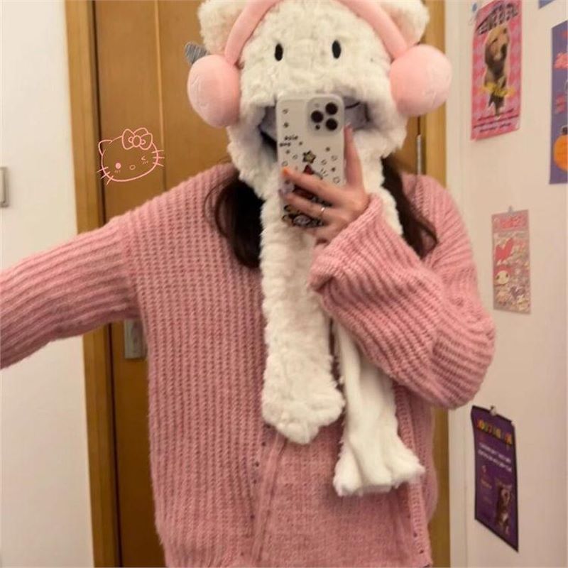 猫の耳の帽子の子供の秋冬2024の新型のぬいぐるみの帽子のマフラーの一体のかわいい保温の耳の学院の風
