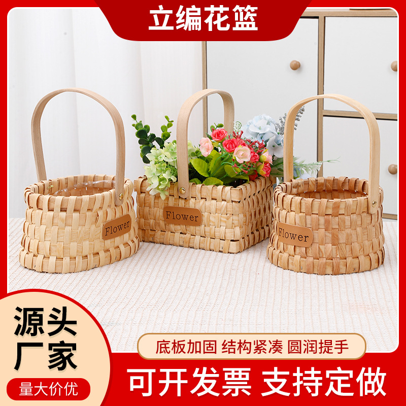 手織りウッドチップ装飾籐母の日フラワーバスケット牧歌的なお土産ハンドバッグフラワーアレンジメント小さなバスケット