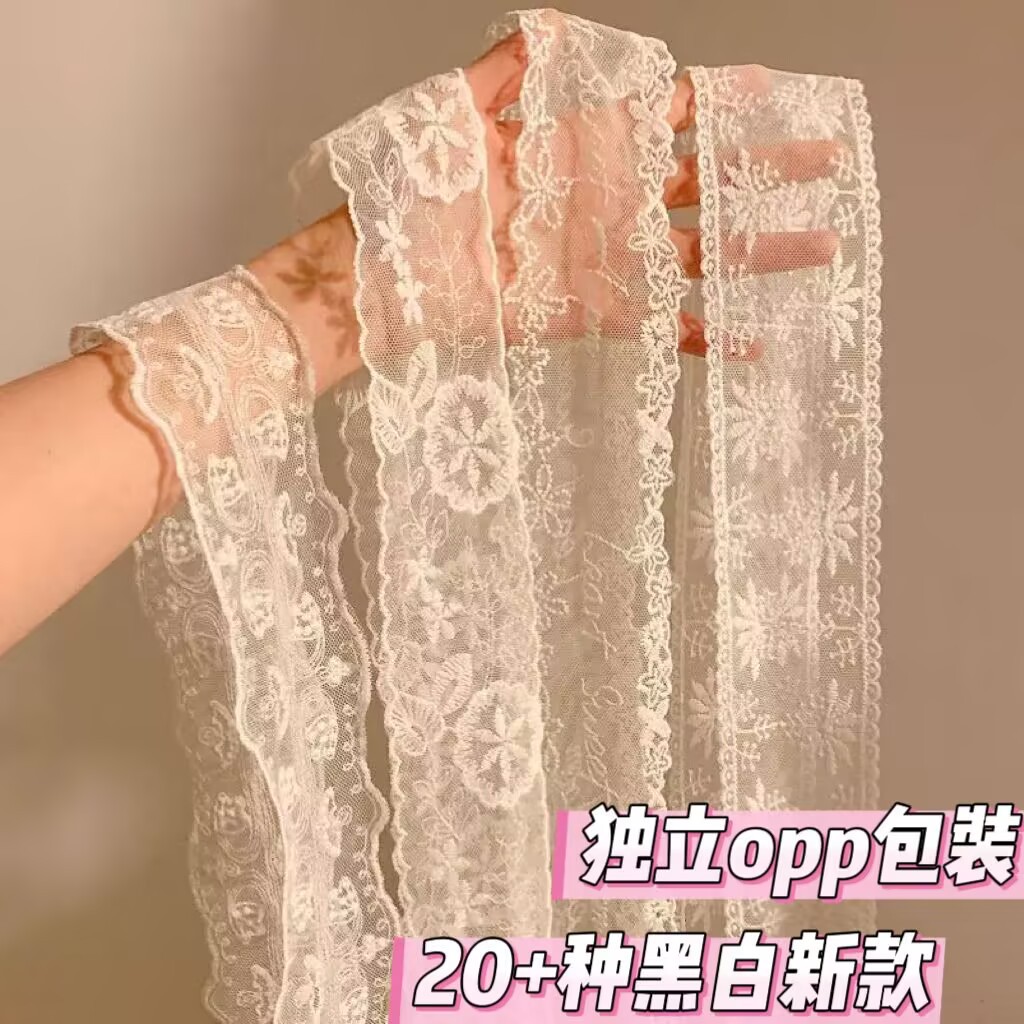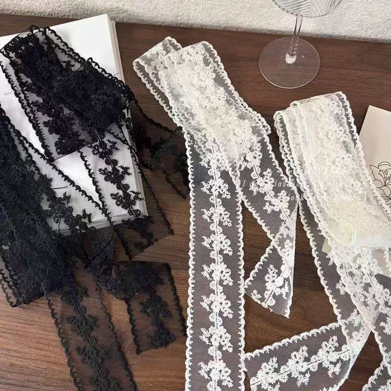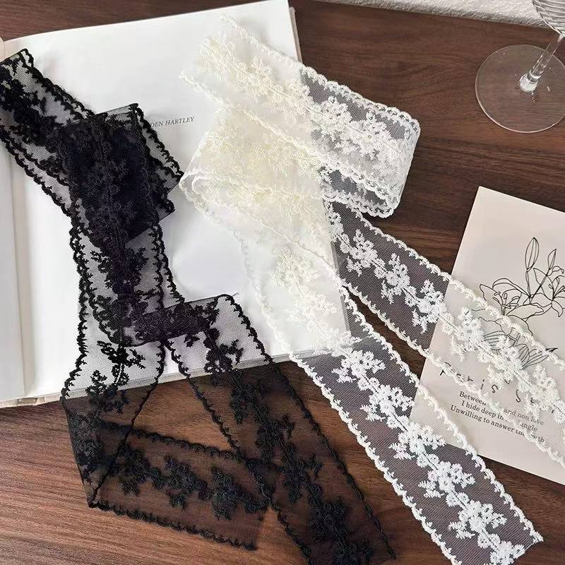 高级感白黒レース花刺繍シルクスカーフバンドヘアバンドベルトレースリボンファッションシルクスカーフアクセサリー