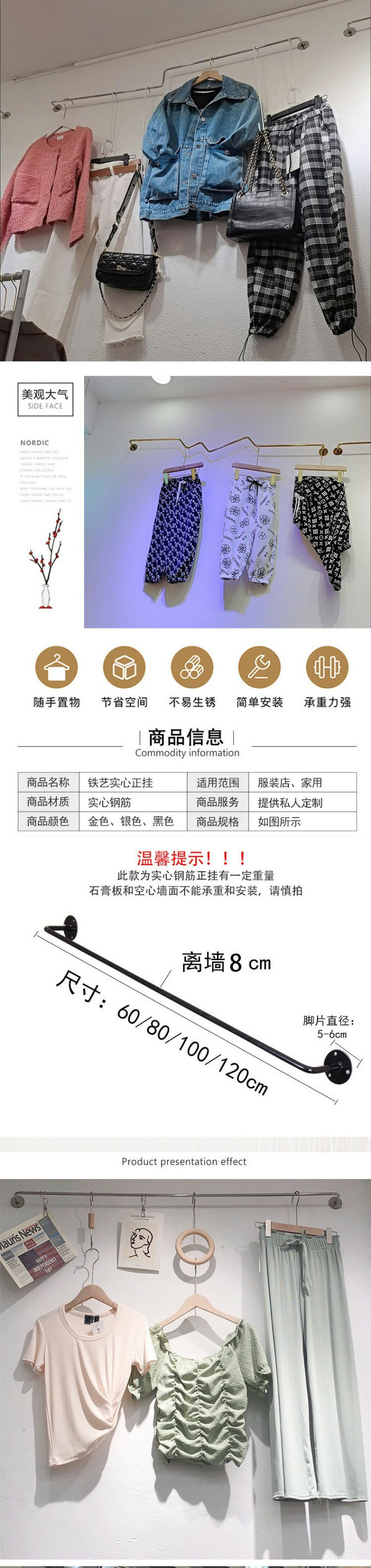 高档服装店上墙不锈钢正挂简约展示架墙壁侧挂男女装挂墙衣杆架子