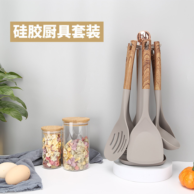家庭用ノンスティックシリコンキッチン用品7点セット、木目調カバー、収納スプーン、粉つかみ、クロスボーダー新作